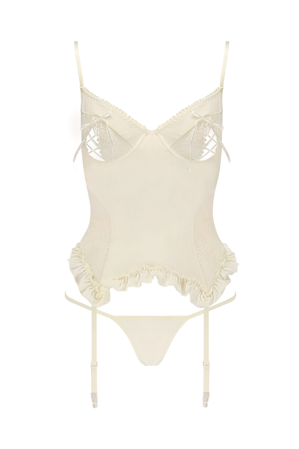 Gorset marki Avanua. Model Bianca corset. Produkt został wykonany z 75% poliester, 15% poliamid, 10% elastan. Posiada druty, które podpierają piersi odpowiednio je kształtując. Majtki biodrówki. Produkt damski. Produkt posiada regulowane ramiączka. Troczki są regulowane. Pas z troczkami.