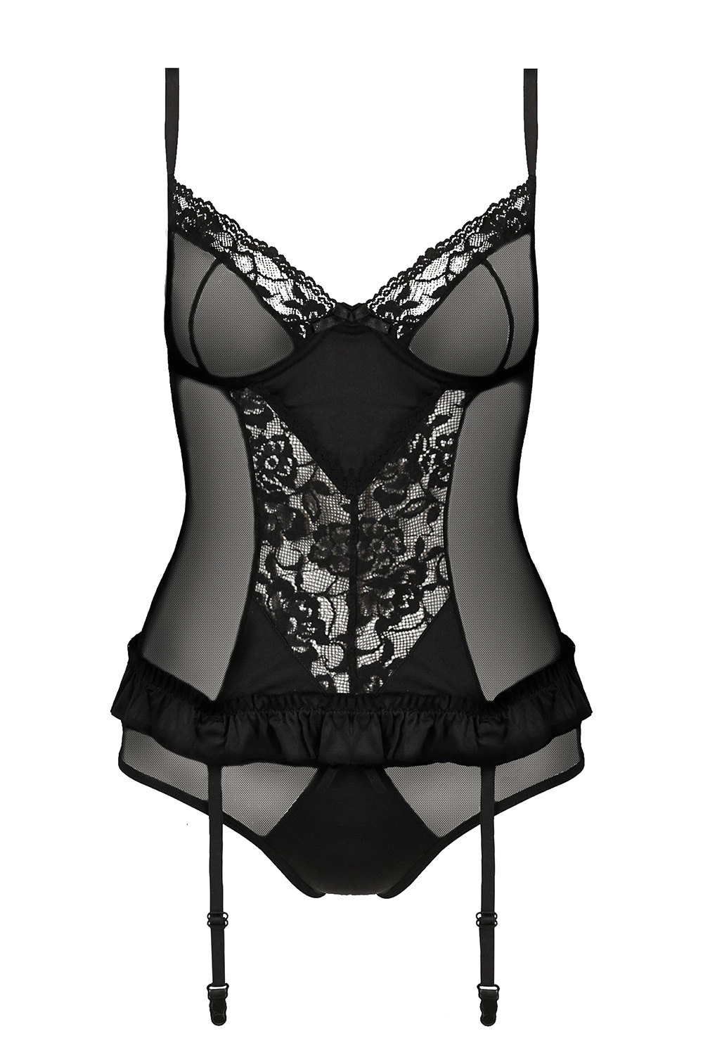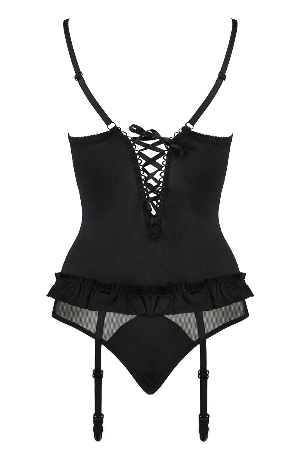 Gorset marki Avanua. Model Melek corset. Produkt został wykonany z 75% poliester, 15% poliamid, 10% elastan. Pas z troczkami. Posiada druty, które podpierają piersi odpowiednio je kształtując. Majtki biodrówki. Troczki są regulowane. Produkt damski. Produkt posiada regulowane ramiączka.