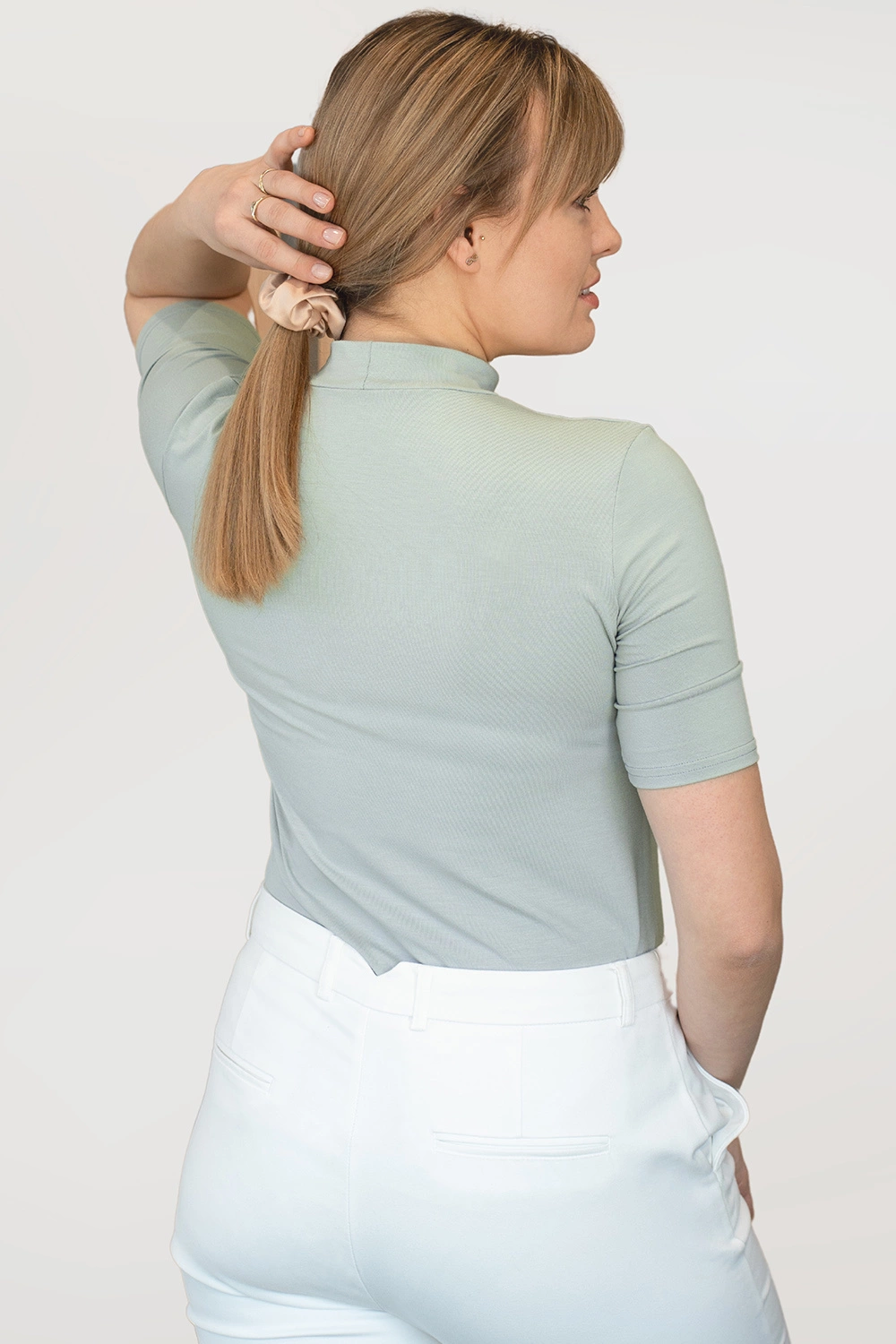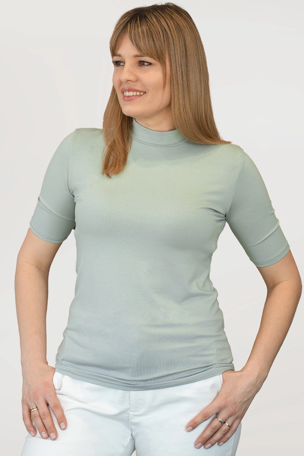 Bluzka marki Babell. Model Layla. Produkt został wykonany z 94% wiskoza, 6% elastan. Długość rękawa: krótki. Rodzaj dekoltu: stójka. Produkt damski.