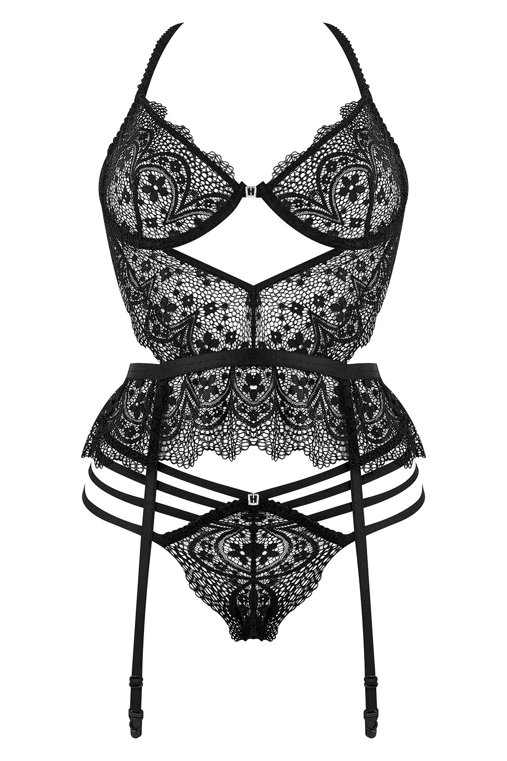 Beauty Night Lace Temptation BN6746 Nocna komplet biustonosz + stringi + pas do pończoch, black