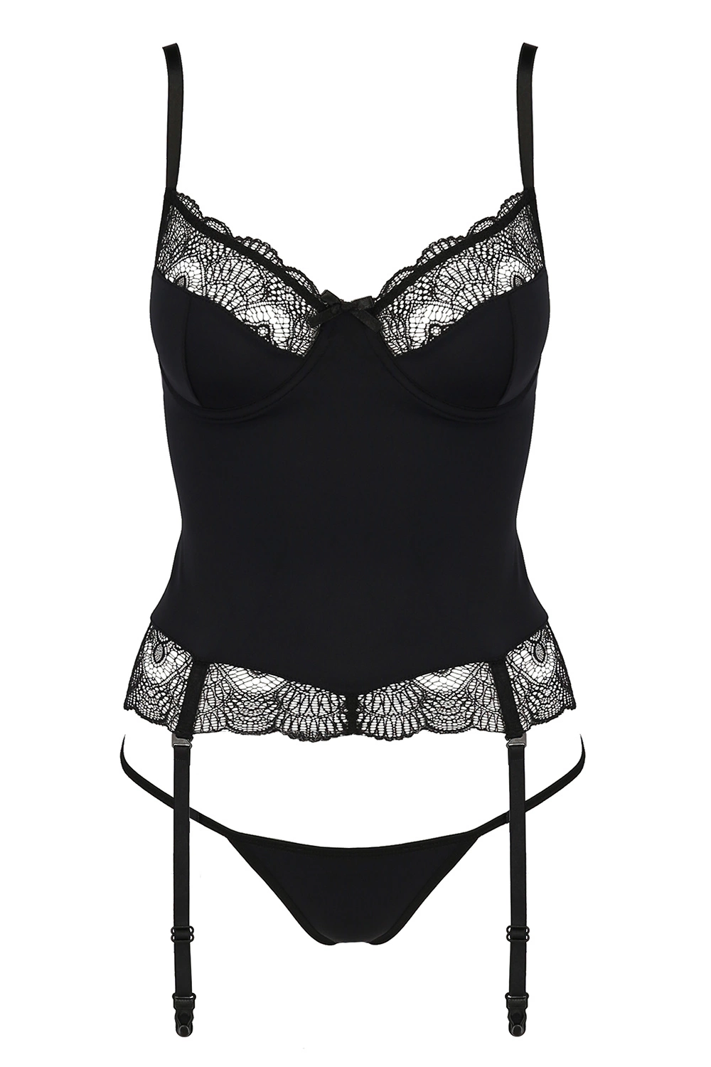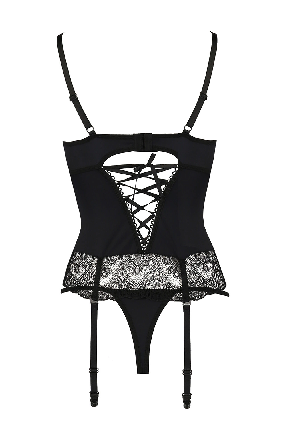 Gorset marki Casmir. Model Alina corset. Produkt został wykonany z 85% poliamid, 8% elastan, 7% poliester. Miejsce zapięcia: tył. Pas z troczkami. Gorset zapinany na haftki. Produkt posiada regulowane ramiączka. Troczki są regulowane. Majtki biodrówki. Produkt damski. Posiada druty, które podpierają piersi odpowiednio je kształtując.