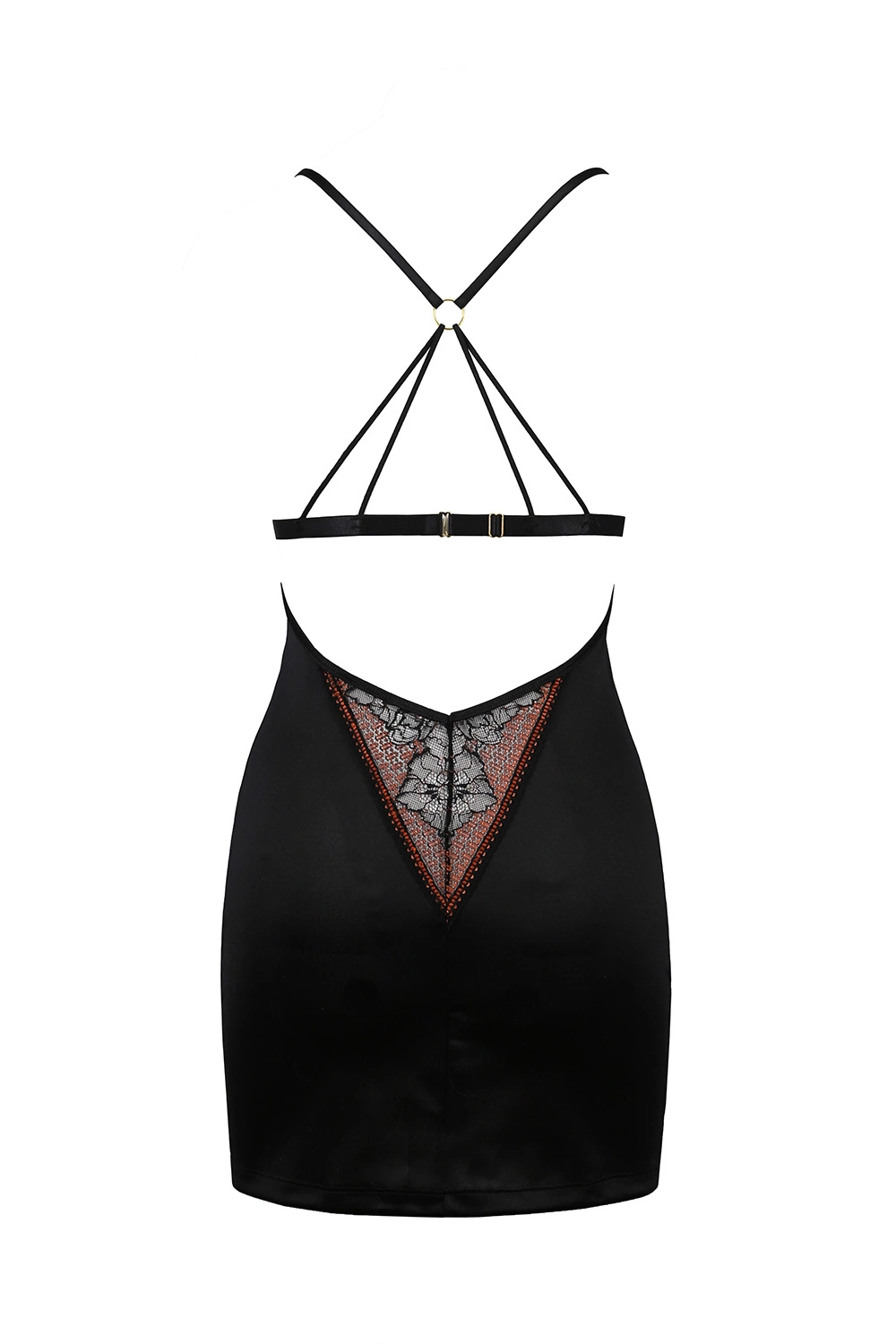 Nocna marki Casmir. Model Mirella chemise. Produkt został wykonany z 85% poliamid, 8% elastan, 7% poliester. Produkt posiada regulowane ramiączka. Nocna zapinany na haczyk. Miejsce zapięcia: tył. Produkt damski. Posiada druty, które podpierają piersi odpowiednio je kształtując. Długość: mini. Majtki biodrówki.
