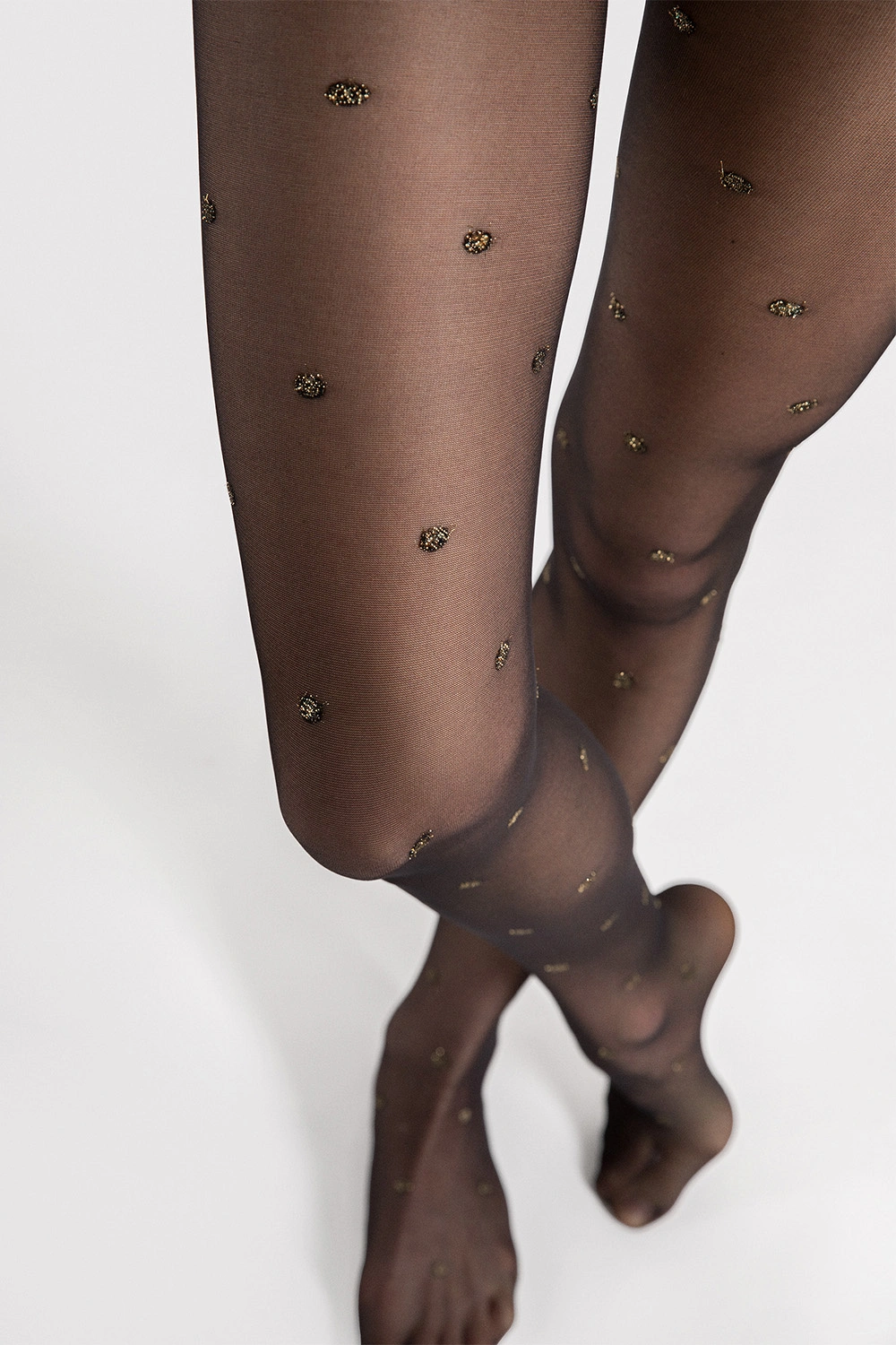 Wyrób pończoszniczy marki Fiore. Model Confetti 20 DEN G6060. Produkt został wykonany z 87% poliamid, 10% elastan, 3% przędza metalizowana. Bez zaznaczonych palców. Grubość: 20 DEN. Produkt damski.