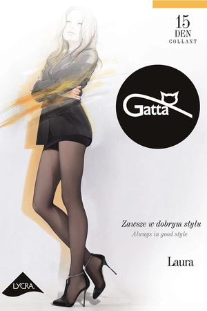 Wyrób pończoszniczy marki Gatta. Model Laura 15. Produkt został wykonany z 87% poliamid, 13% elastan. Z zaznaczonymi palcami. Grubość: 15 DEN. Produkt damski. Zaznaczona część majteczkowa.