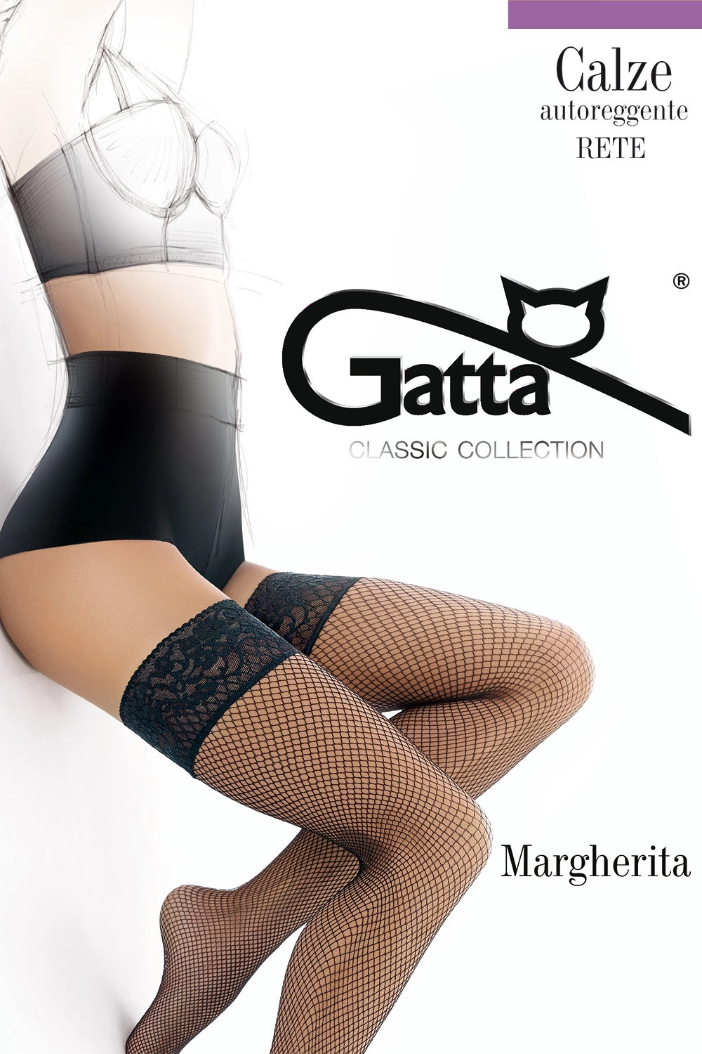 Wyrób pończoszniczy marki Gatta. Model Margherita 01. Produkt został wykonany z 82% poliamid, 18% lycra. Zalety produktu: sexy kabaretka z koronką samonośne. Bez zaznaczonych palców. Zawiera silikonową taśmę podtrzymującą. Produkt damski.