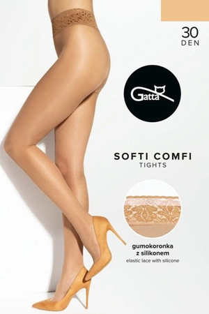 Wyrób pończoszniczy marki Gatta. Model Softi-Comfi 30 DEN. Produkt został wykonany z 88% poliamid, 11% elastan, 1% bawełna. Zawiera silikonową taśmę podtrzymującą. Grubość: 30 DEN. Produkt damski.
