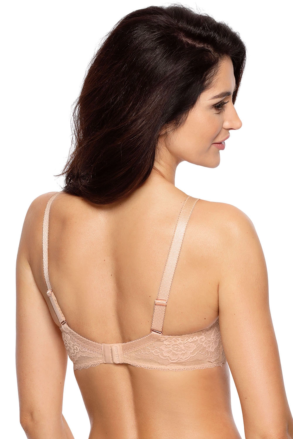 Biustonosz marki Gorteks. Model Nella/B4. Posiada druty, które podpierają piersi odpowiednio je kształtując. Fiszbiny pionowe osadzone na bokach. Produkt posiada regulowane ramiączka bez możliwości ich odpięcia. Haczyki do ramiączek metalowe. Biustonosz zapinany na haftki. Miejsce zapięcia: tył. Produkt został wykonany z 65% poliamid, 20% poliester, 10% bawełna, 5% elastan. Produkt damski.