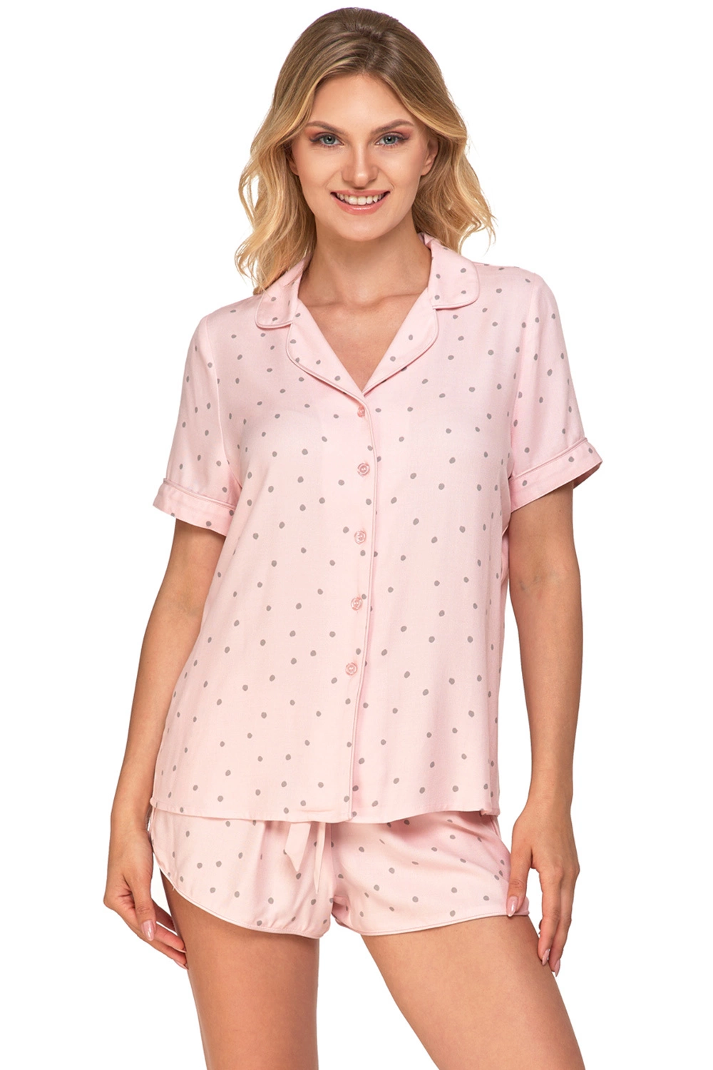 Nocna marki Moraj. Model PDD5300-009. Produkt został wykonany z 100% wiskoza. Miejsce zapięcia: przód. Nocna zapinany na guziki. Długość rękawa: krótki. Długość: krótkie. Produkt damski. Rodzaj dekoltu: szpic.
