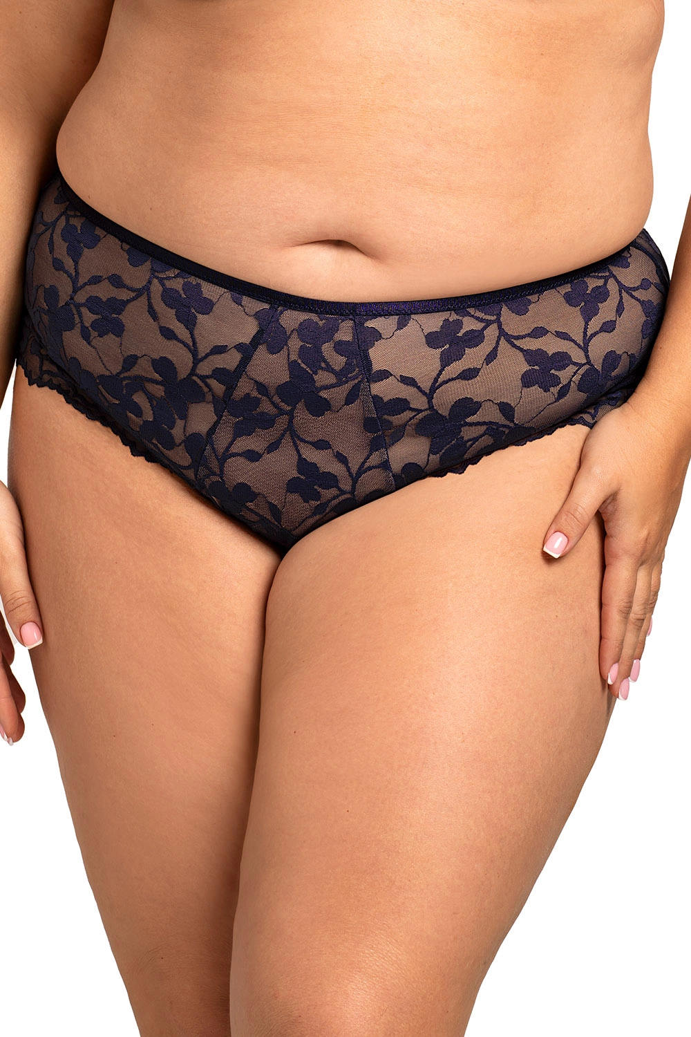 Klasyczne figi Nessa Ana N01 w całości uszyte z elastycznej, miękkiej koronki. Roślinny motyw koronki z subtelnymi prześwitami nadaje lekkości. Gładko wykończona talia i falujące, koronkowe brzegi nogawek dbają o komfort. Tył z tej samej koronki, spójny z przodem. Model praktyczny na co dzień i estetyczny w komplecie z koronkową górą.Skład: poliamid 85%, elastan 15%.