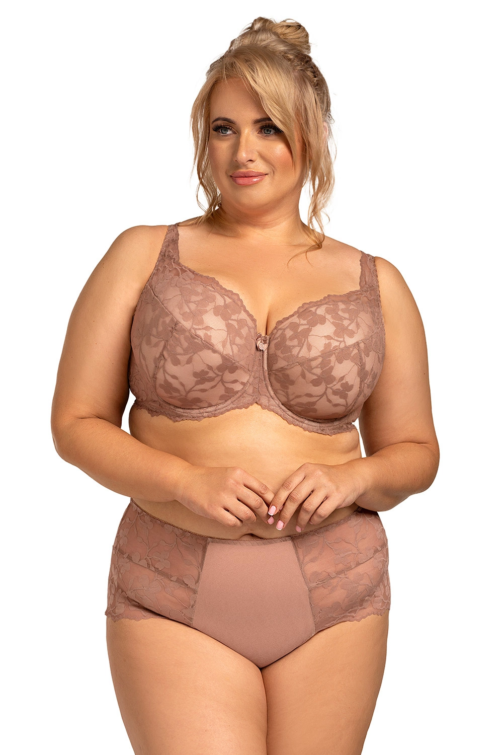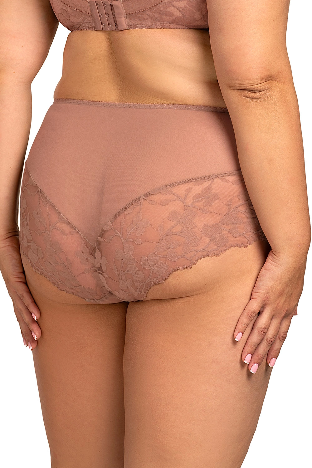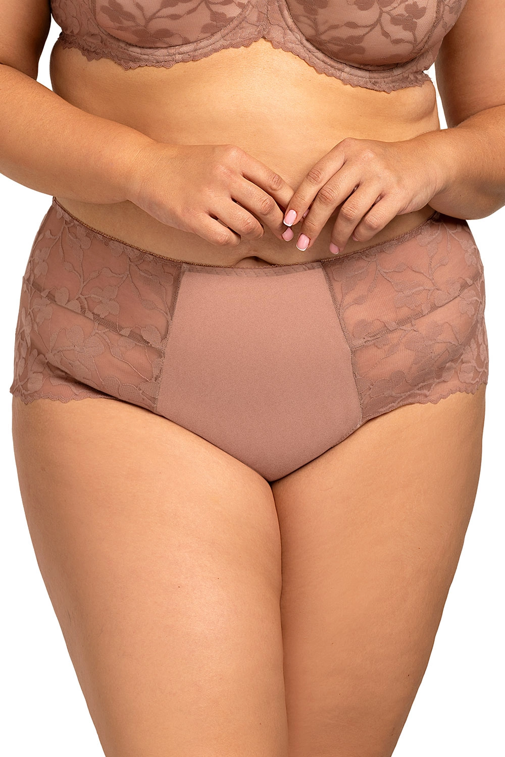 Nessa Ana N02 to wysokie figi łączące gładką dzianinę z koronkowymi panelami o roślinnym motywie. Przód oferuje subtelne prześwity, tył pozostaje gładki i w pełni kryjący. Elastyczny pas i obrębienia nogawek zapewniają stabilne dopasowanie i komfort. Fason wysokiego stanu delikatnie otula brzuch, sprawdzając się w codziennym użytkowaniu. Świetny wybór do stylizacji wymagających wygody i estetyki.Skład: poliamid: 85%; elastan: 15%.