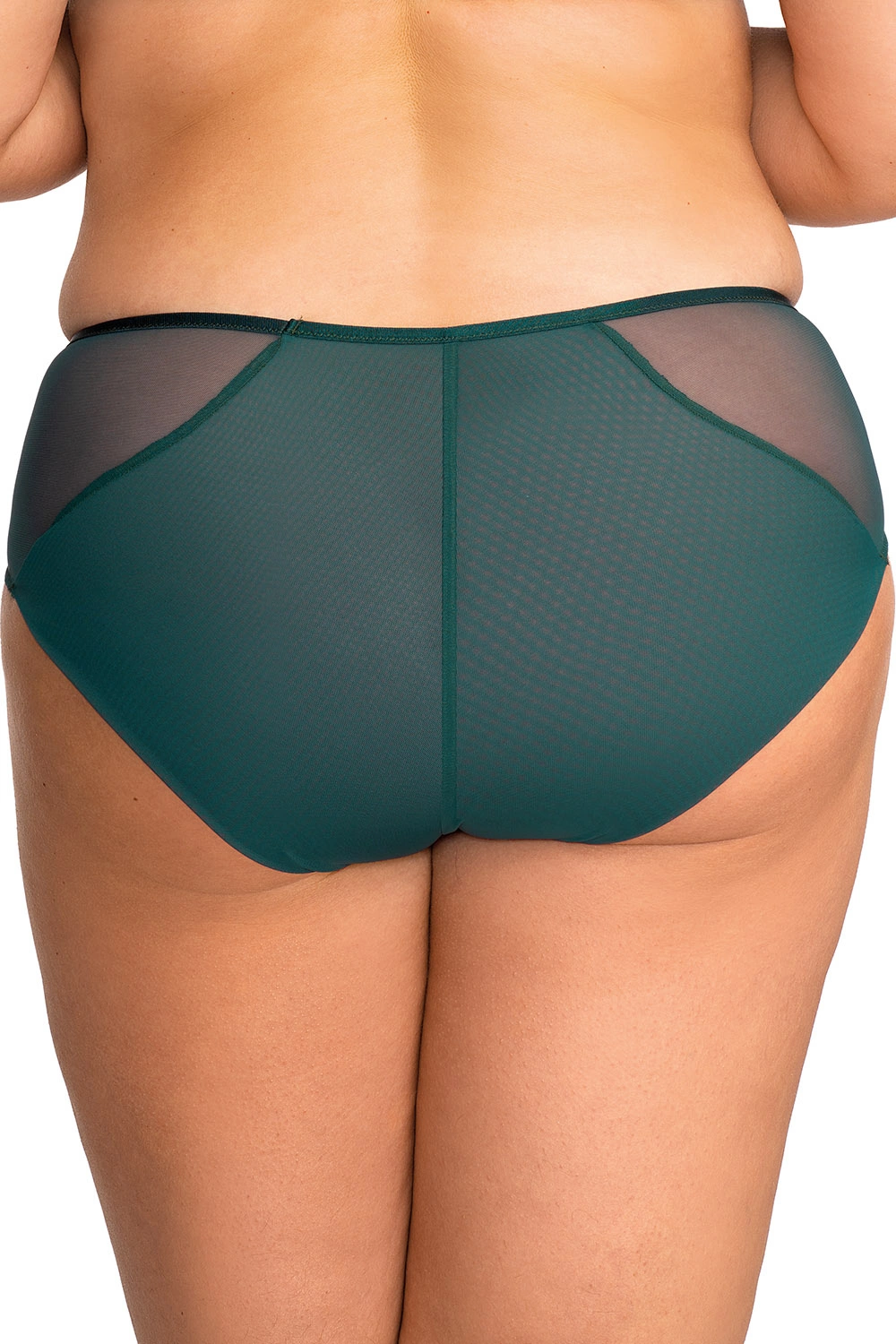 Figi Nessa Nadine N01 w klasycznym kroju z gładkim tyłem i koronkowymi wstawkami po bokach. Przód łączy kryjący panel z delikatną siateczką, zapewniając lekkość i kobiecy charakter. Elastyczne wykończenia gwarantują wygodne dopasowanie. Model odpowiedni do codziennego noszenia i kompletowania z biustonoszem z tej linii.Skład: 85% poliamid, 15% elastan.