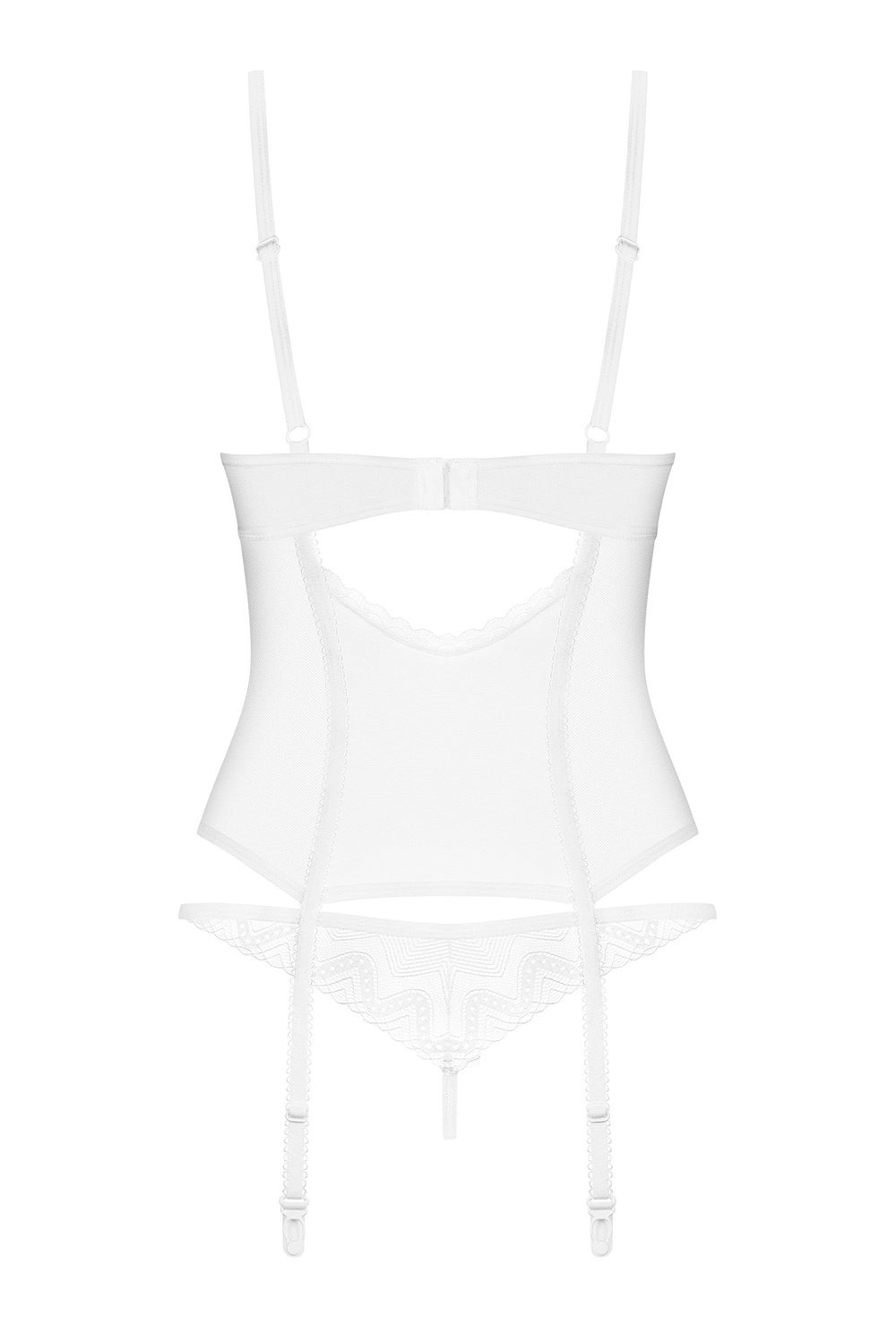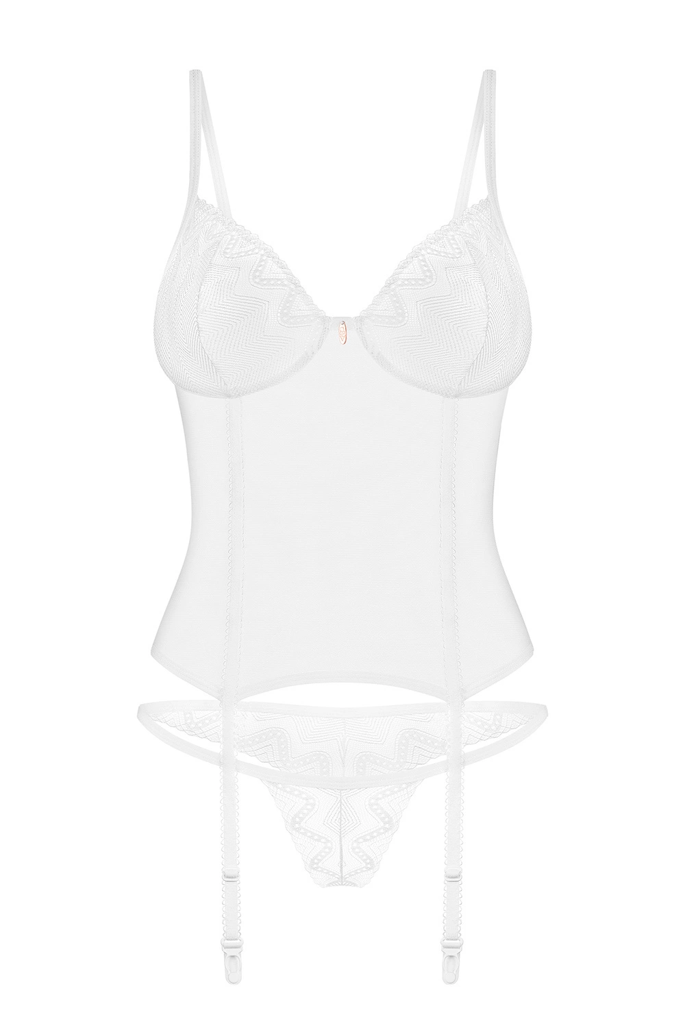 Gorset marki Obsessive. Model Alissium corset & thong. Produkt został wykonany z 94% poliamid, 6% elastan. Miejsce zapięcia: tył. Pas z troczkami. Majtki biodrówki. Troczki są regulowane. Produkt damski. Posiada druty, które podpierają piersi odpowiednio je kształtując. Gorset zapinany na haftki.