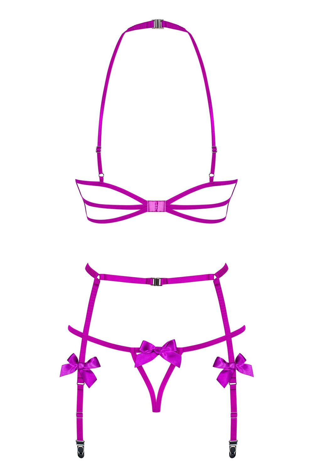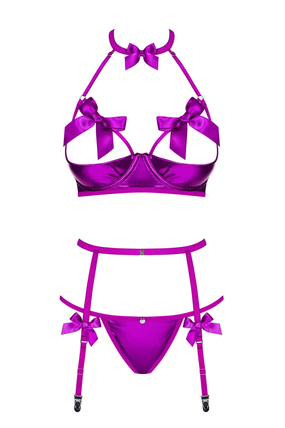 Obsessive Delishya 3-pcs set Nocna komplet biustonosz + stringi + pas do pończoch, fioletowy
