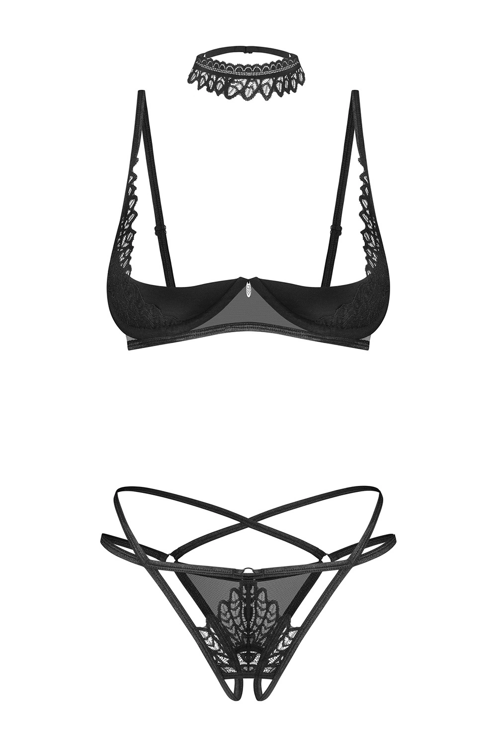 Obsessive Donarella 3-pcs set Nocna komplet półbiustonosz + stringi otwarte, black