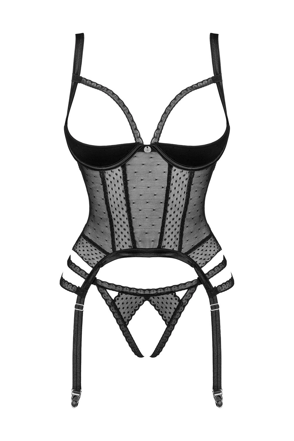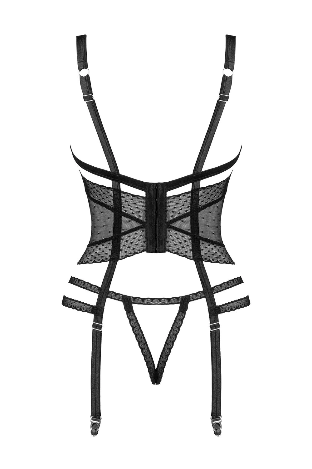 Gorset marki Obsessive. Model Lanelia corset. Produkt został wykonany z 85% poliamid, 15% elastan. Miejsce zapięcia: tył. Pas z troczkami. Haczyki do ramiączek metalowe. Sześć rzędów haftek pionowych. Produkt damski. Produkt posiada regulowane ramiączka. Trzy stopnie haftek poziomych. Majtki biodrówki. Troczki są regulowane. Bielizna wyróżnia się rozcięciem w kroku. Gorset zapinany na haftki. Posiada druty, które podpierają piersi odpowiednio je kształtując.