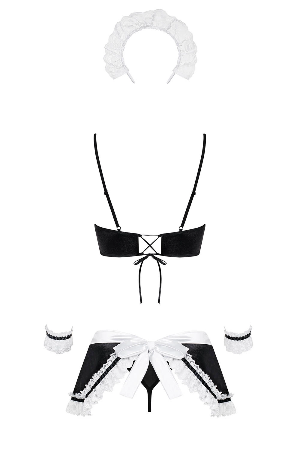 Nocna marki Obsessive. Model Maid. Produkt został wykonany z 90% poliamid, 10% elastan. Produkt posiada regulowane ramiączka. Nocna zapinany na wiązane. Miejsce zapięcia: tył. Produkt damski. Haczyki do ramiączek plastikowe. Długość: mini. Majtki biodrówki.