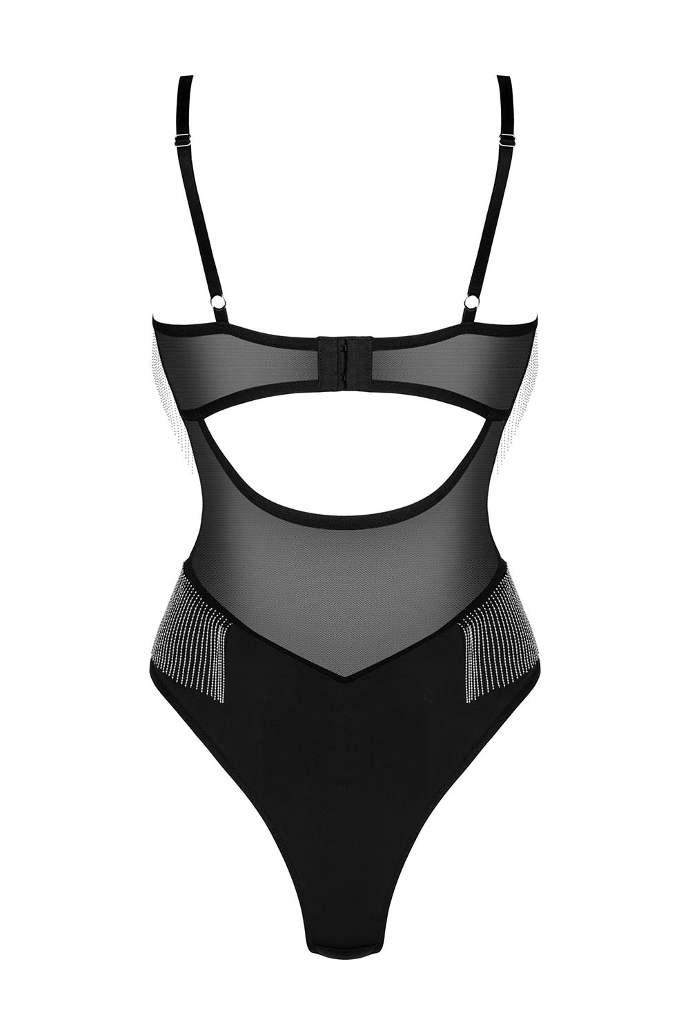 Body marki Obsessive. Model Milladis teddy. Posiada druty, które podpierają piersi odpowiednio je kształtując. Z zapięciem w kroku. Body zapinany na haftki. Haczyki do ramiączek metalowe. Produkt został wykonany z 90% poliamid, 10% elastan. Produkt posiada regulowane ramiączka bez możliwości ich odpięcia. Miejsce zapięcia: tył. Produkt damski.