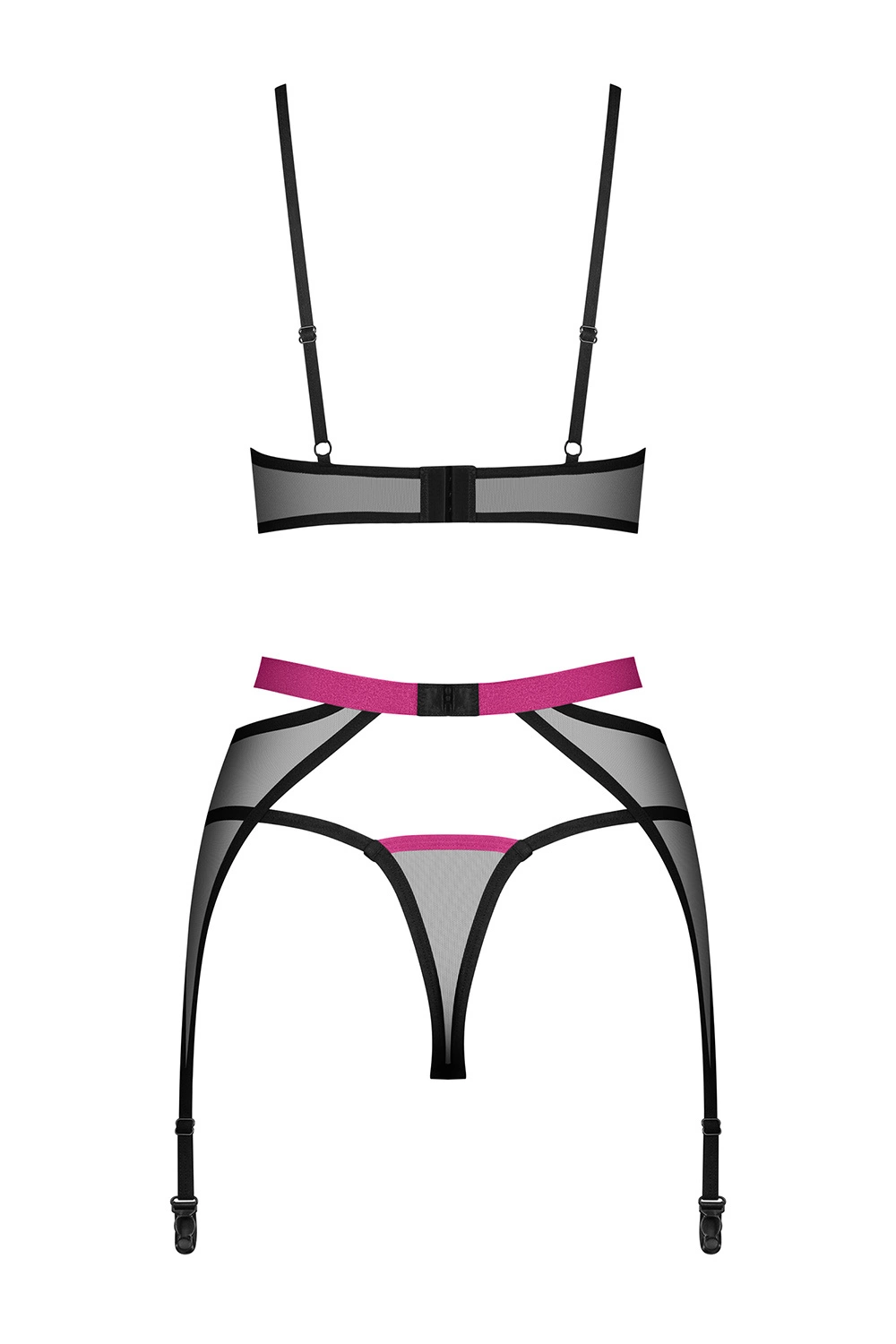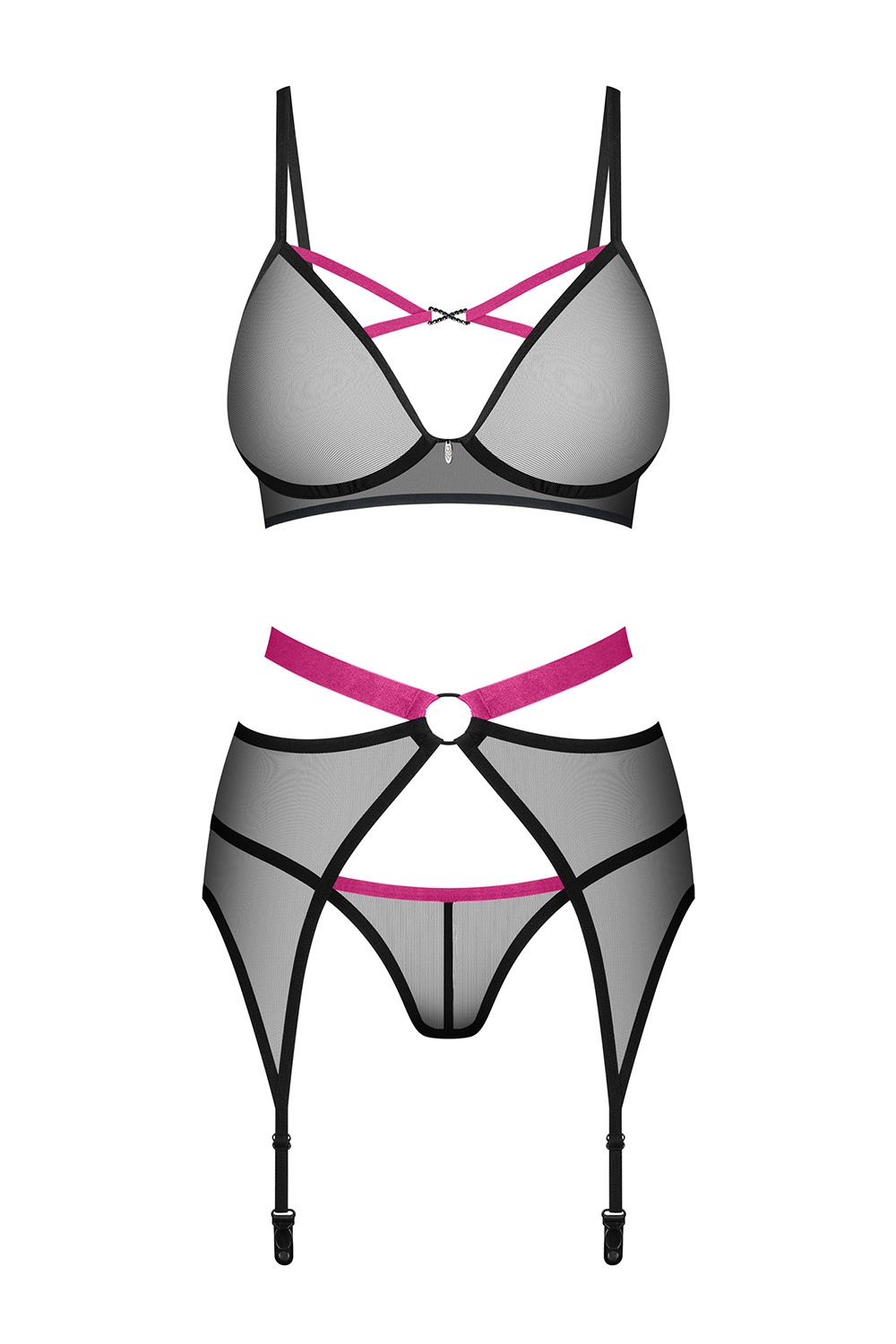 Obsessive Novenes 3-pcs set Nocna komplet biustonosz + stringi + pas do pończoch, black