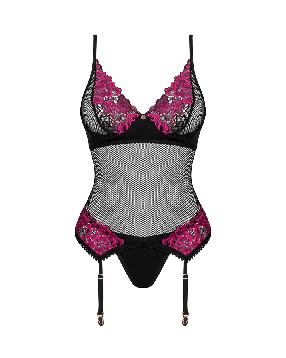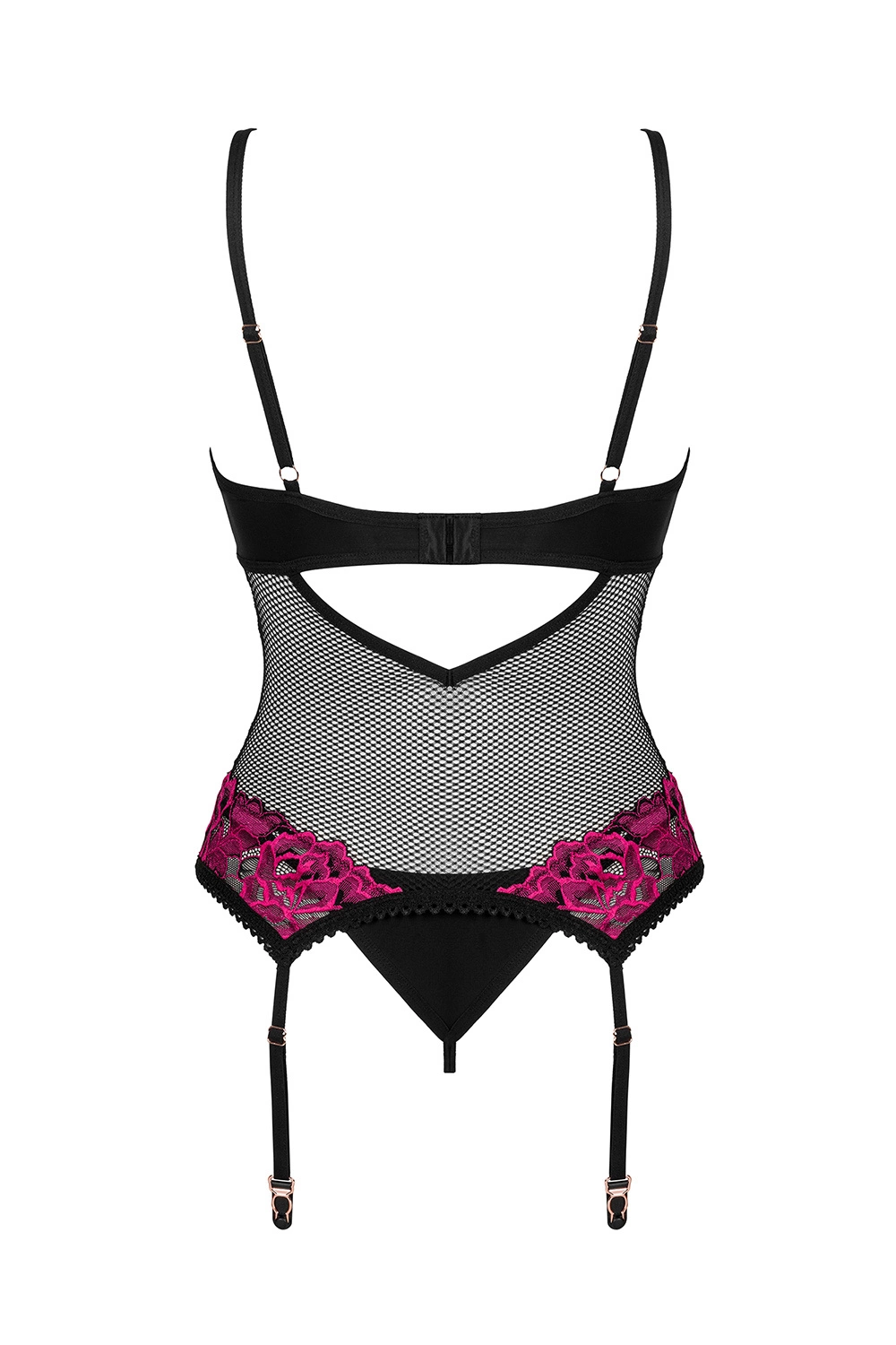Gorset marki Obsessive. Model Rosenty corset. Produkt został wykonany z 85% poliamid, 15% elastan. Miejsce zapięcia: tył. Troczki są regulowane. Produkt damski. Produkt posiada regulowane ramiączka. Gorset zapinany na haftki. Majtki biodrówki. Pas z troczkami. Posiada druty, które podpierają piersi odpowiednio je kształtując.