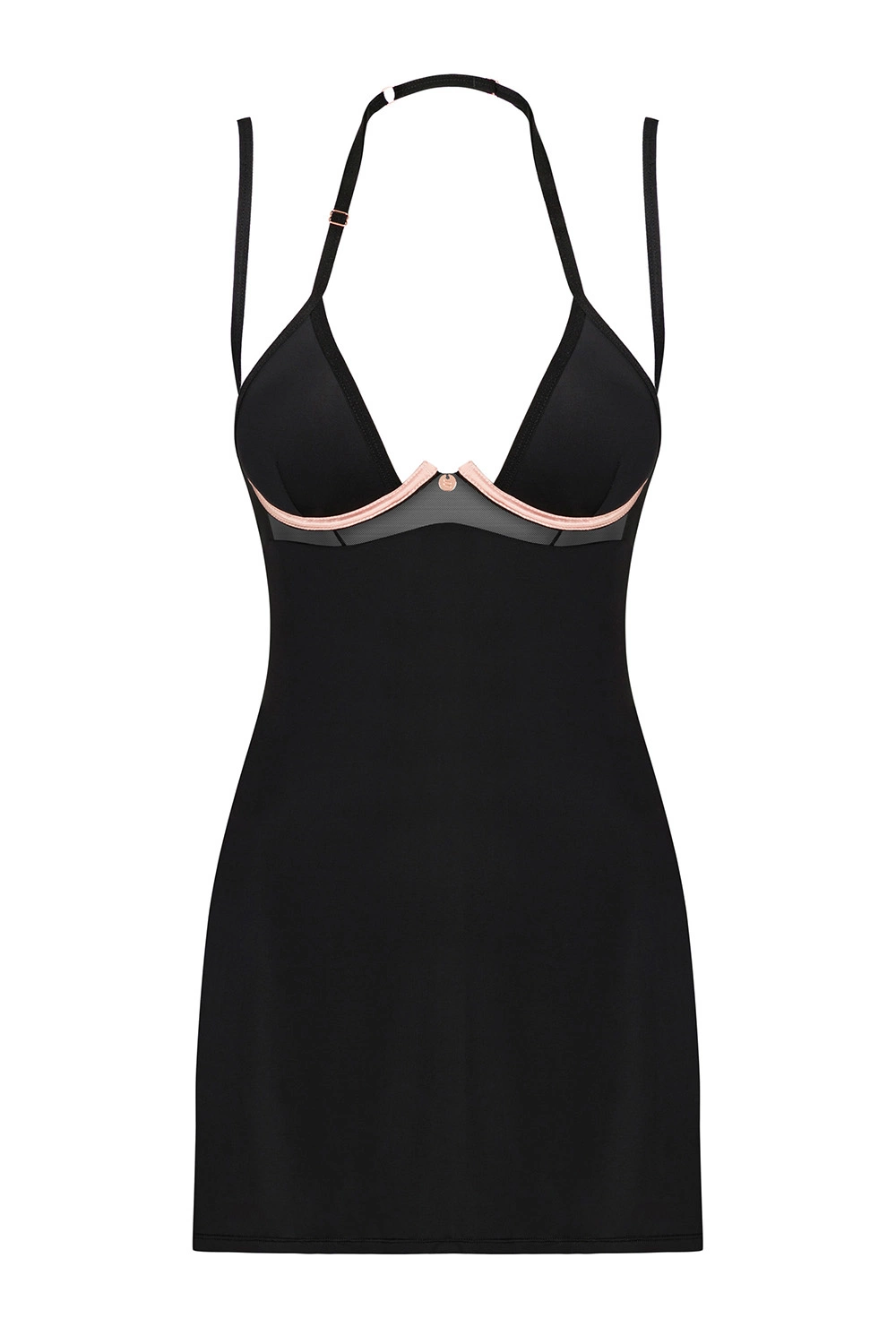 Nocna marki Obsessive. Model Selinne chemise. Produkt został wykonany z 85% poliamid, 15% elastan. Produkt posiada regulowane ramiączka. Nocna zapinany na haftki. Miejsce zapięcia: tył. Produkt damski. Posiada druty, które podpierają piersi odpowiednio je kształtując. Haczyki do ramiączek metalowe. Długość: mini.