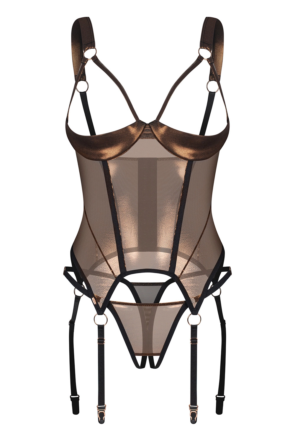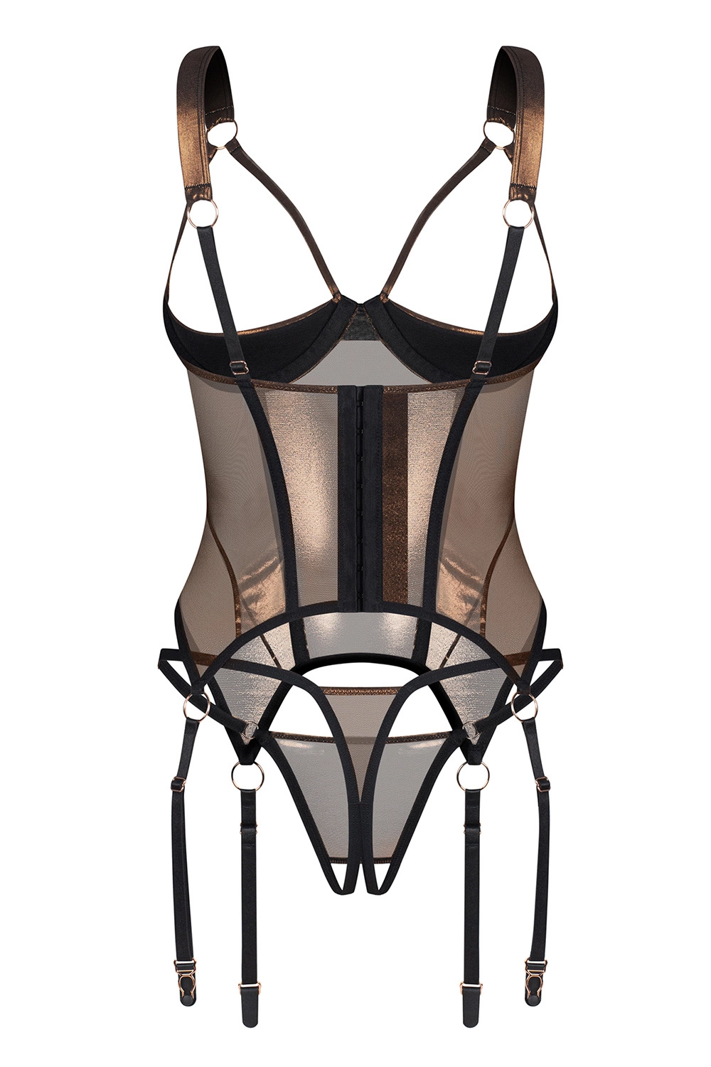 Gorset marki Obsessive. Model Soranna corset & crotchless thong. Produkt został wykonany z 95% poliester, 5% elastan. Fiszbiny pionowe osadzone na bokach. Miejsce zapięcia: tył. Produkt damski. Majtki klasyczne. Gorset zapinany na haftki. Bielizna wyróżnia się rozcięciem w kroku. Haczyki do ramiączek metalowe. Posiada druty, które podpierają piersi odpowiednio je kształtując. Produkt posiada regulowane ramiączka.