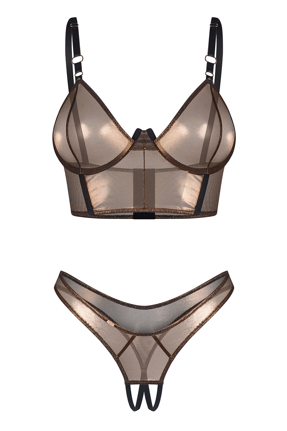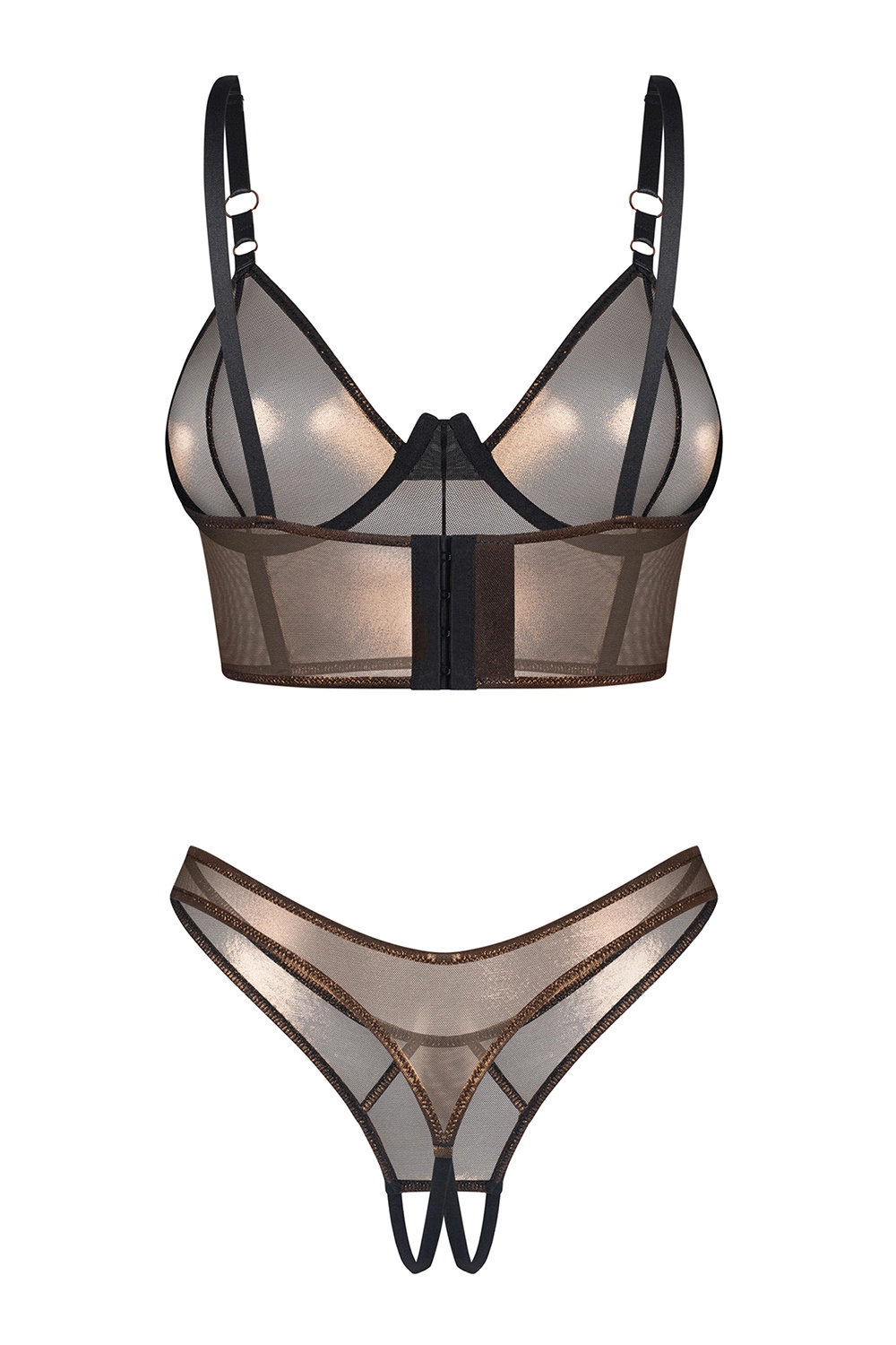 Nocna marki Obsessive. Model Soranna top & crotchless thong. Produkt został wykonany z 95% poliester, 5% elastan. Posiada druty, które podpierają piersi odpowiednio je kształtując. Produkt damski. Nocna zapinany na haftki. Haczyki do ramiączek metalowe. Produkt posiada regulowane ramiączka. Bielizna wyróżnia się rozcięciem w kroku. Miejsce zapięcia: tył. Majtki klasyczne. Fiszbiny pionowe osadzone na bokach.