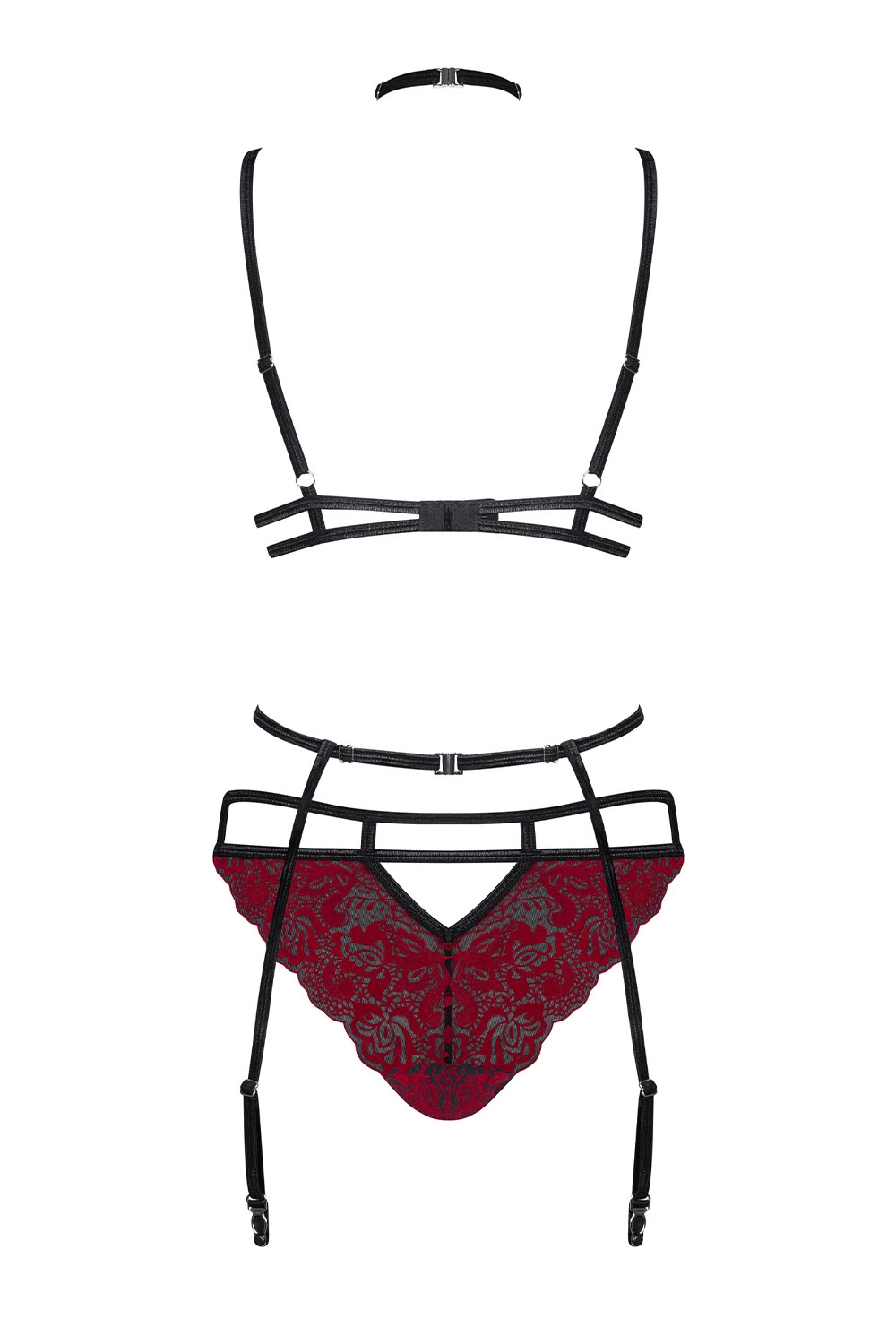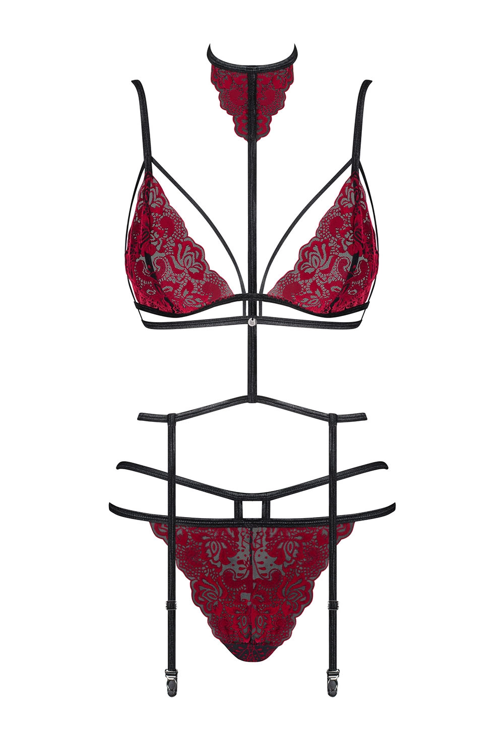 Obsessive Sugestina 3-pcs set Nocna komplet biustonosz + figi + pas do pończoch, bordowy