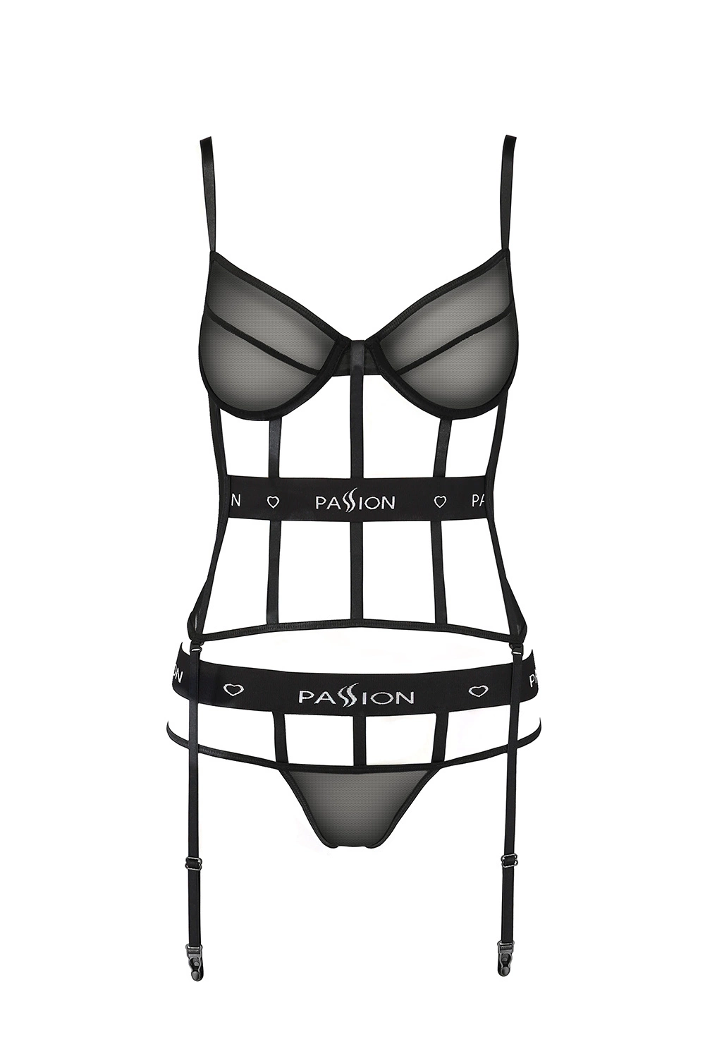 Gorset marki Passion. Model Kyouka corset. Produkt został wykonany z 75% poliamid, 15% poliester, 10% elastan. Miejsce zapięcia: tył. Majtki biodrówki. Posiada druty, które podpierają piersi odpowiednio je kształtując. Gorset zapinany na haftki. Troczki są regulowane. Produkt posiada regulowane ramiączka. Pas z troczkami. Produkt damski.