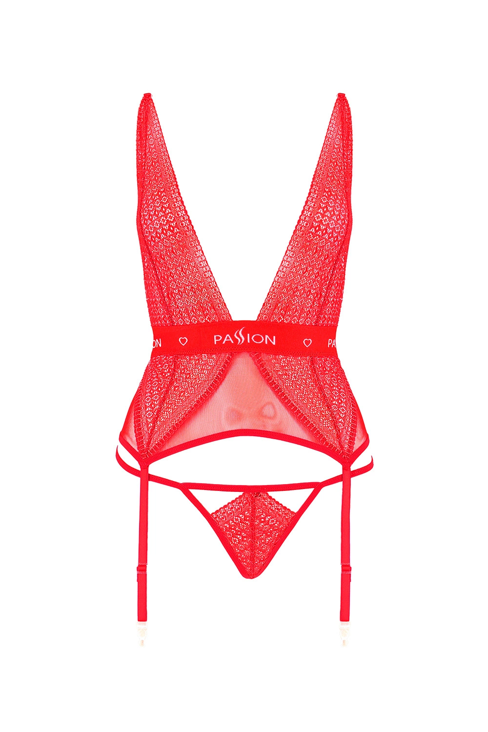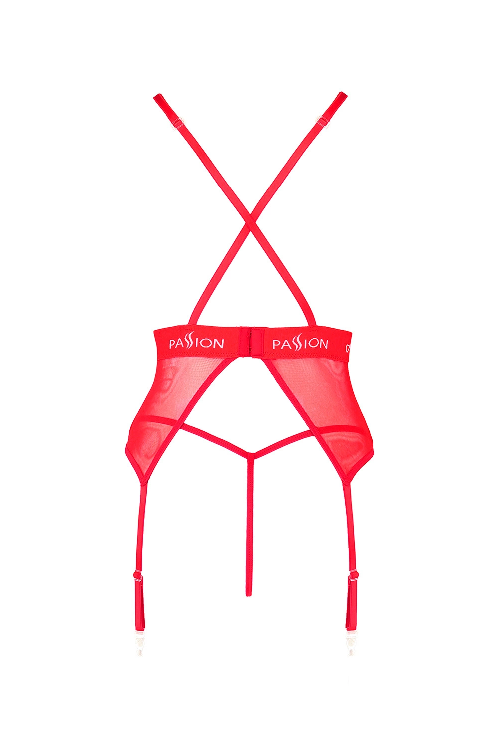 Gorset marki Passion. Model Mirajane corset. Produkt został wykonany z 75% poliester, 15% poliamid, 10% elastan. Miejsce zapięcia: tył. Produkt posiada regulowane ramiączka. Troczki są regulowane. Produkt damski. Pas z troczkami. Gorset zapinany na haftki. Majtki biodrówki.