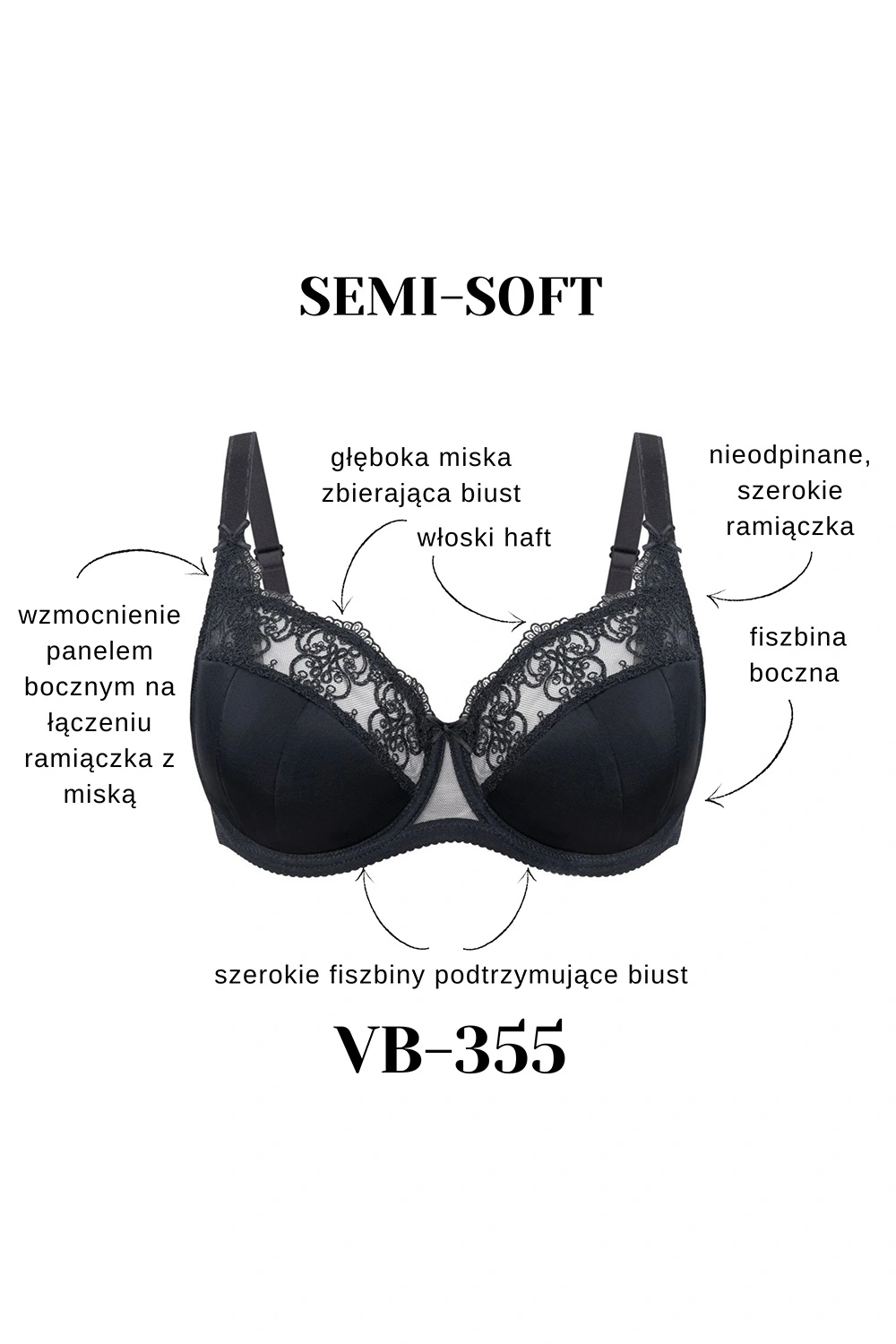Biustonosz marki Vena. Model VB-355. Posiada druty, które podpierają piersi odpowiednio je kształtując. Fiszbiny pionowe osadzone na bokach. Produkt posiada regulowane ramiączka bez możliwości ich odpięcia. Haczyki do ramiączek metalowe. Biustonosz zapinany na haftki. Miejsce zapięcia: tył. Dwa rzędy haftek pionowych. Cztery stopnie haftek poziomych. Produkt został wykonany z 75% poliamid, 15% elastan, 5% poliester, 5% bawełna. Produkt damski.