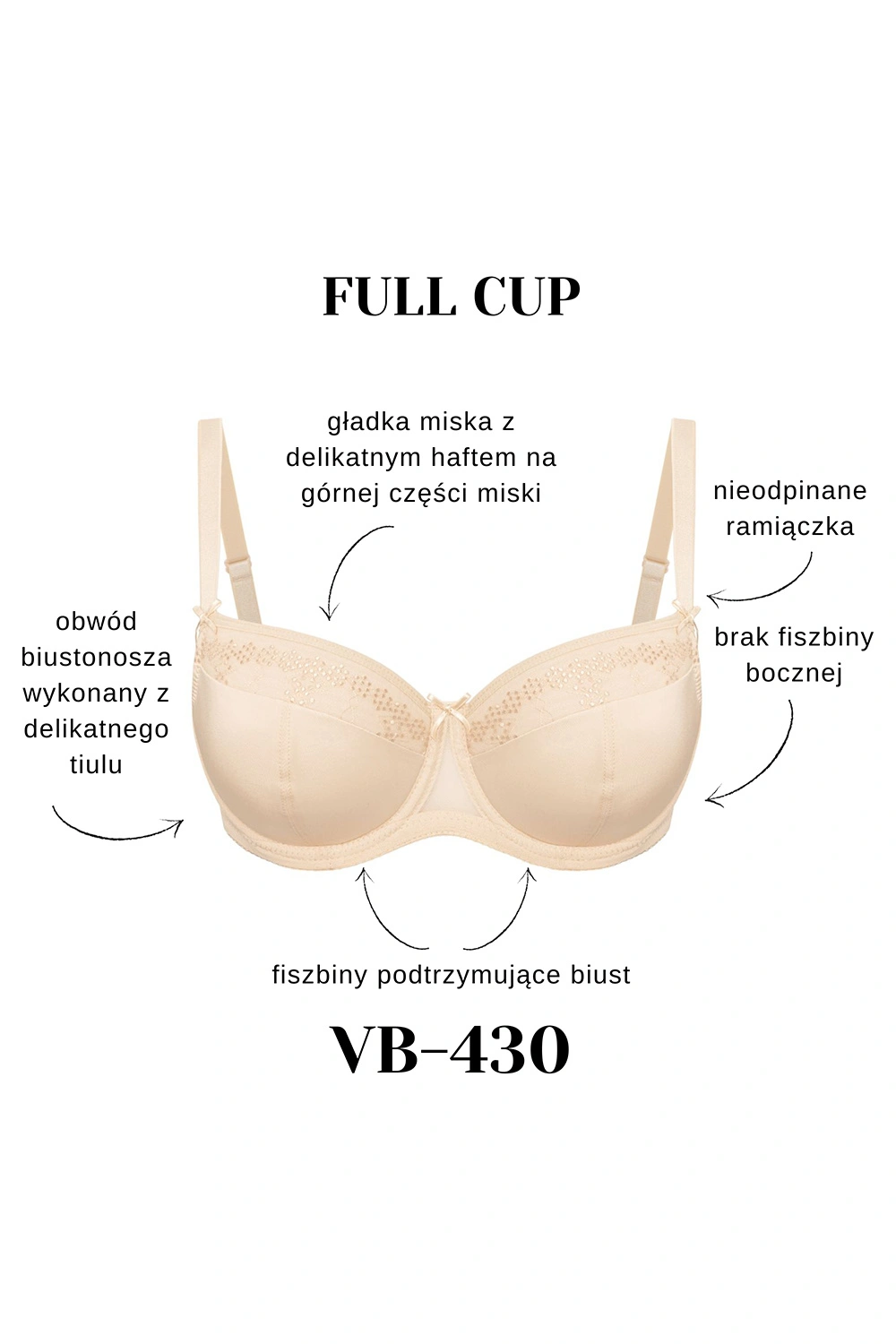 Biustonosz marki Vena. Model VB-430. Posiada druty, które podpierają piersi odpowiednio je kształtując. Haczyki do ramiączek metalowe. Biustonosz zapinany na haftki. Miejsce zapięcia: tył. Dwa rzędy haftek pionowych. Cztery stopnie haftek poziomych. Produkt został wykonany z 75% poliamid, 15% elastan, 5% poliester, 5% bawełna. Produkt damski.
