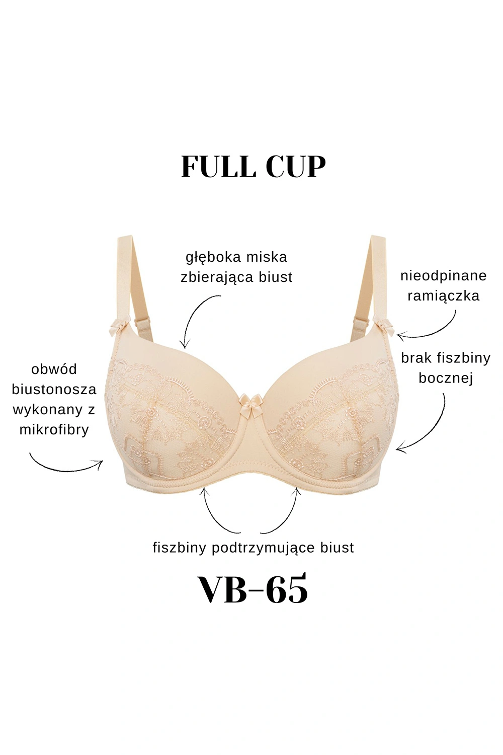 Biustonosz marki Vena. Model VB-65. Posiada druty, które podpierają piersi odpowiednio je kształtując. Fiszbiny pionowe osadzone na bokach. Produkt posiada regulowane ramiączka bez możliwości ich odpięcia. Haczyki do ramiączek metalowe. Biustonosz zapinany na haftki. Miejsce zapięcia: tył. Dwa rzędy haftek pionowych. Trzy stopnie haftek poziomych. Produkt został wykonany z 75% poliamid, 15% elastan, 5% poliester, 5% bawełna. Produkt damski.