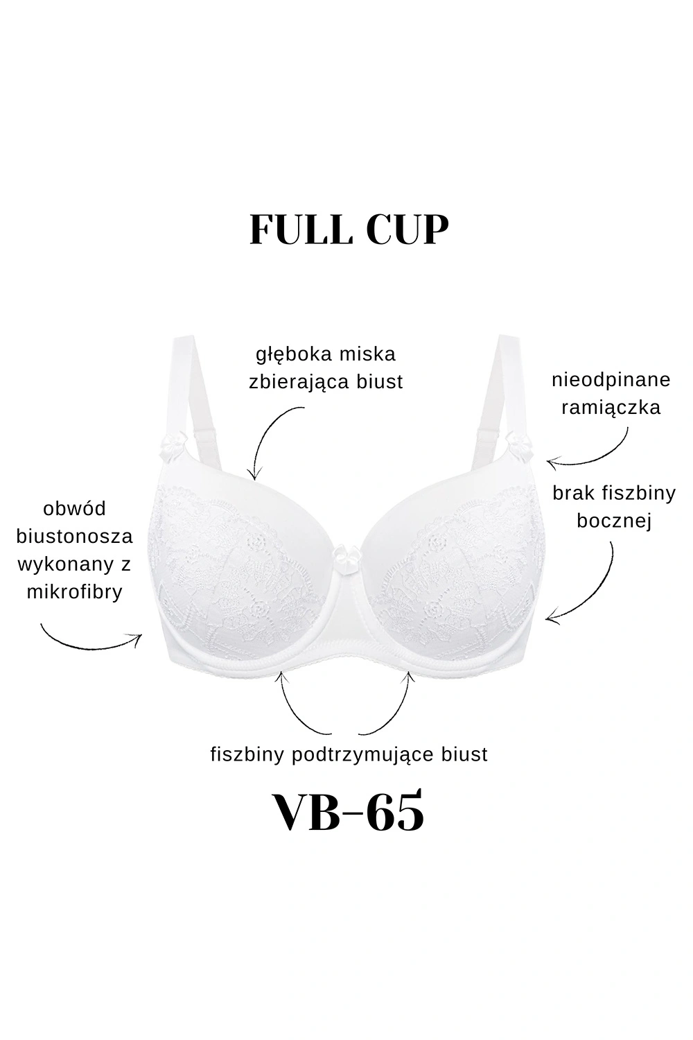 Biustonosz marki Vena. Model VB-65. Posiada druty, które podpierają piersi odpowiednio je kształtując. Fiszbiny pionowe osadzone na bokach. Produkt posiada regulowane ramiączka bez możliwości ich odpięcia. Haczyki do ramiączek metalowe. Biustonosz zapinany na haftki. Miejsce zapięcia: tył. Dwa rzędy haftek pionowych. Trzy stopnie haftek poziomych. Produkt został wykonany z 75% poliamid, 15% elastan, 5% poliester, 5% bawełna. Produkt damski.