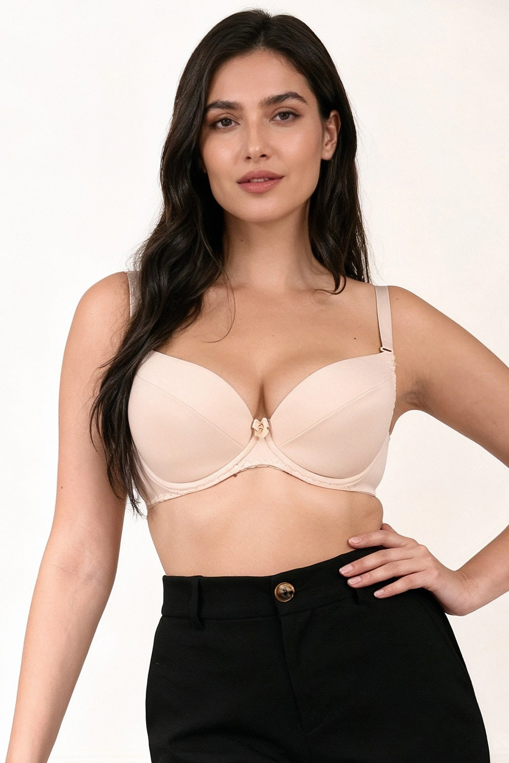 Wyprofilowane miseczki typu push-up unoszą i zbierają biust, podkreślając dekolt i zapewniając naturalnie zaokrąglony kształt. Wewnątrz miseczek znajdują się kieszonki na wkładki, co pozwala dopasować poziom wypełnienia do własnych potrzeb. Konstrukcja z fiszbinami stabilnie podtrzymuje, a brak pionowych fiszbin bocznych zwiększa komfort w ciągu dnia. Odpinane, regulowane ramiączka dają możliwość dopasowania do różnych fasonów ubrań lub noszenia w wielu konfiguracjach. Metalowe zaczepy i regulatory ramiączek podnoszą trwałość użytkowania. Zapięcie z tyłu na haftki z kilkustopniową regulacją pozwala precyzyjnie dopasować obwód. Materiał jest elastyczny i przyjemny w dotyku, dzięki czemu biustonosz dobrze pracuje z ciałem i układa się gładko pod ubraniem. To praktyczny model na co dzień i pod bardziej dopasowane stylizacje, kiedy liczy się wygoda i czysta linia pod odzieżą.
