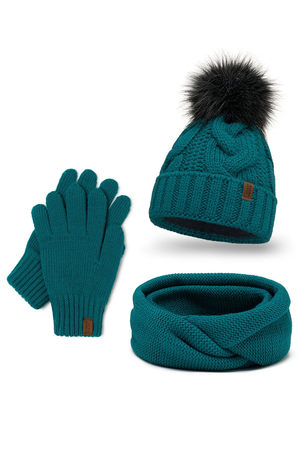 Modny komplet: czapka z pomponem, komin i rękawiczki.