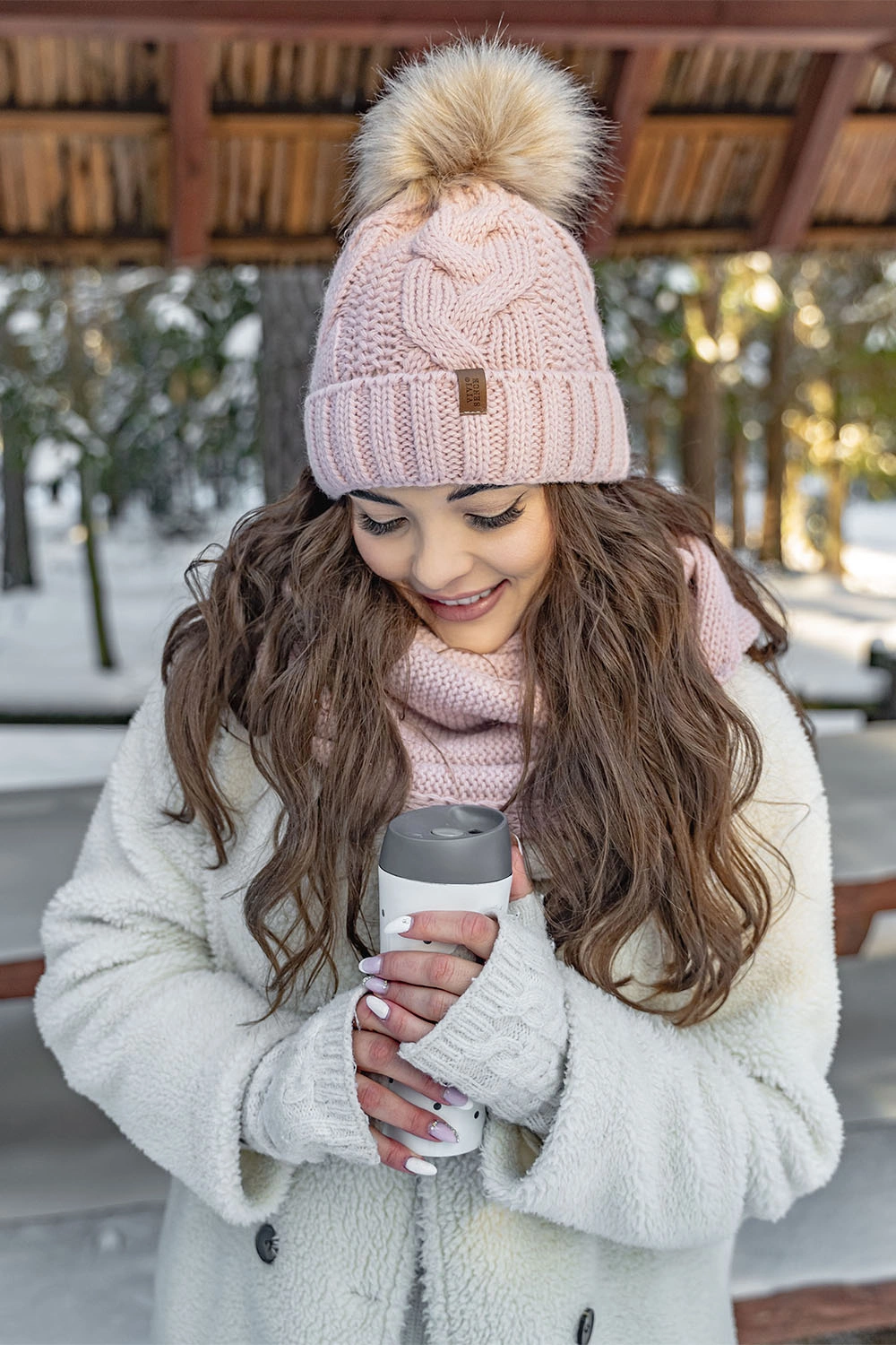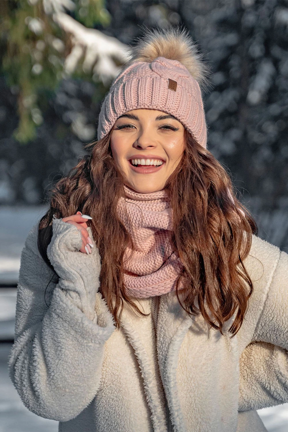 Modny komplet: czapka z pomponem, komin i rękawiczki.