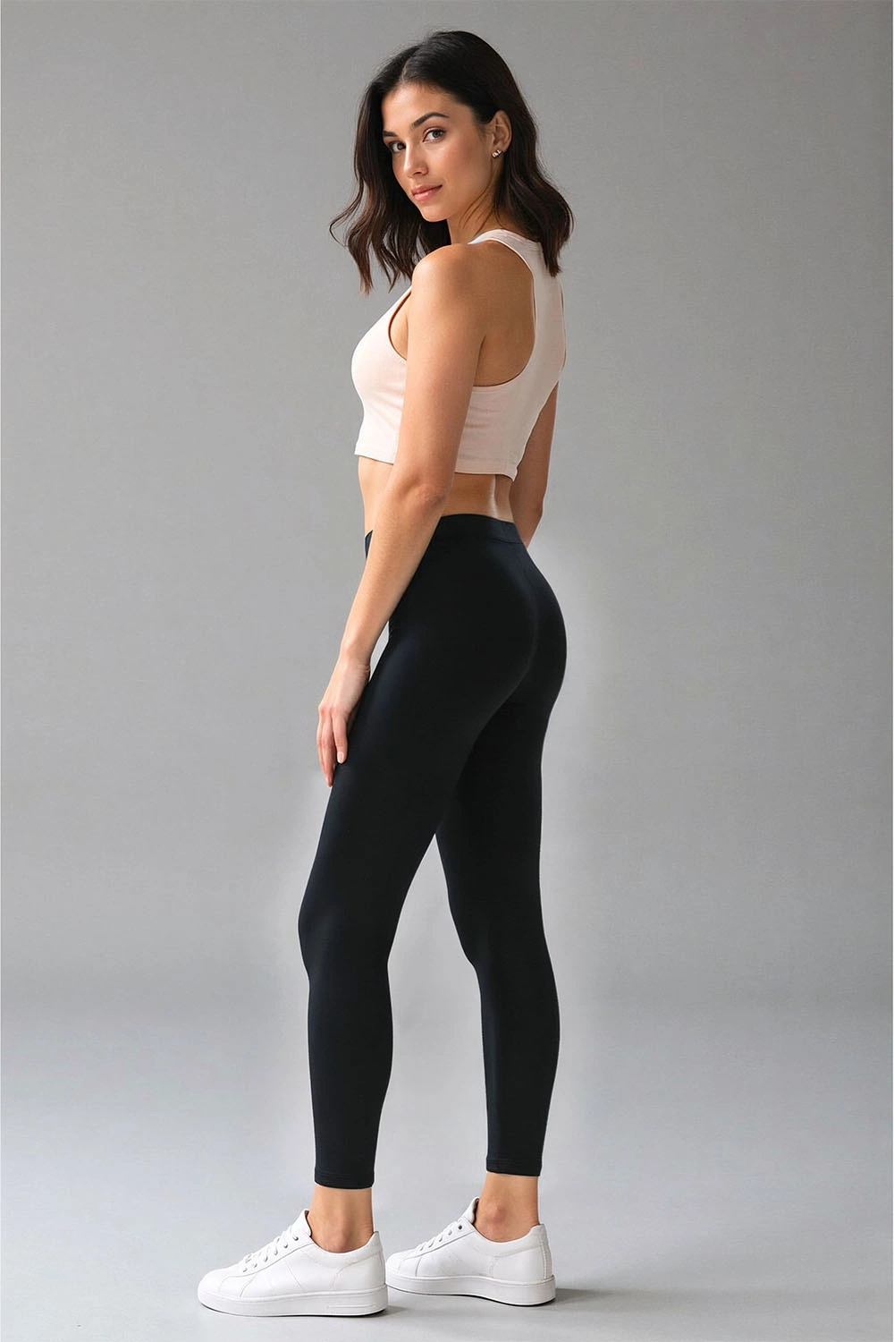 Gładkie legginsy w czarnym kolorze.