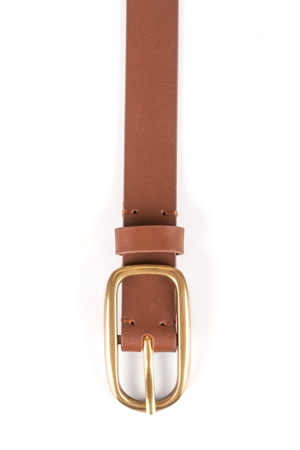 Pasek ze skóry naturalnej z zaokrągloną złotą klamerką.