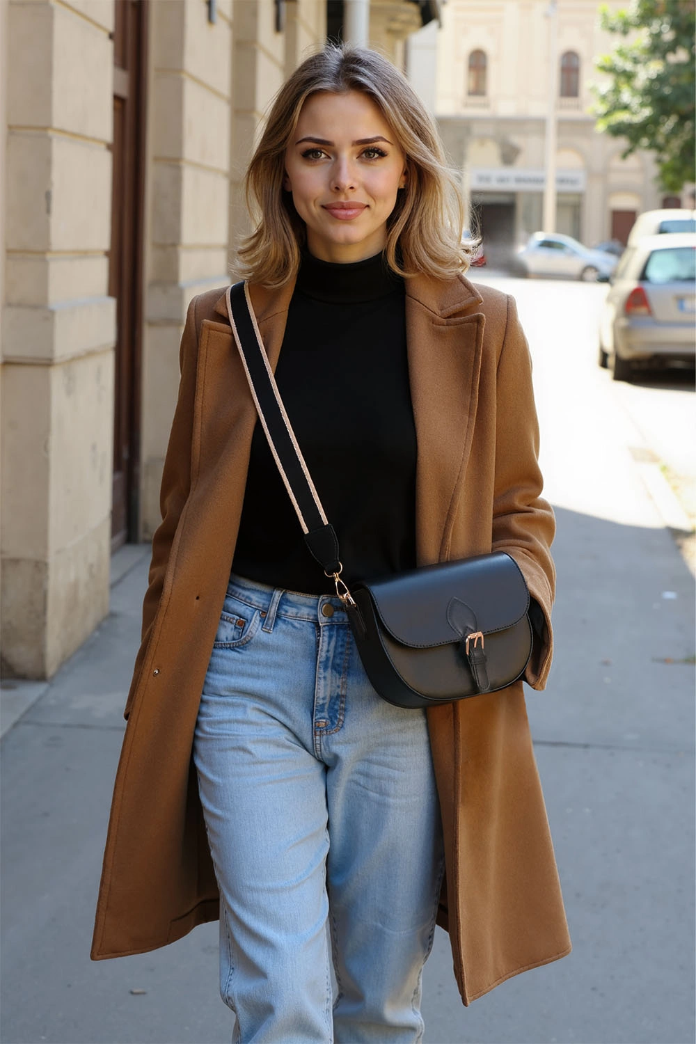 - mała torebka typu listonoszka z ozdobnym paskiem z przodu i zapięciem na magnes