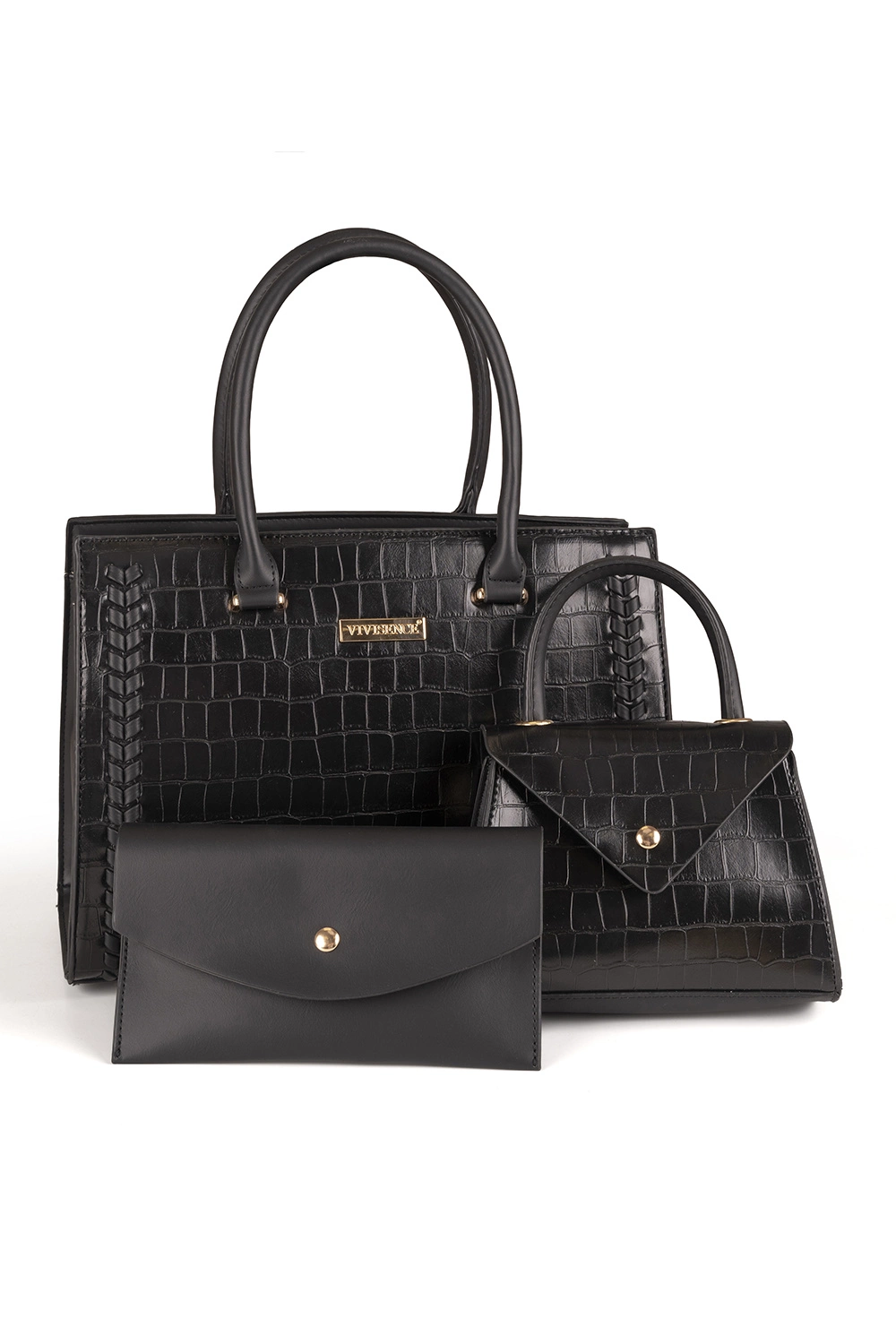 • stylowa damska torebka typu kuferek sprzedawana w praktycznym zestawie: duża torebka główna, mała torebka do ręki, kompaktowy portfelik na drobiazgi